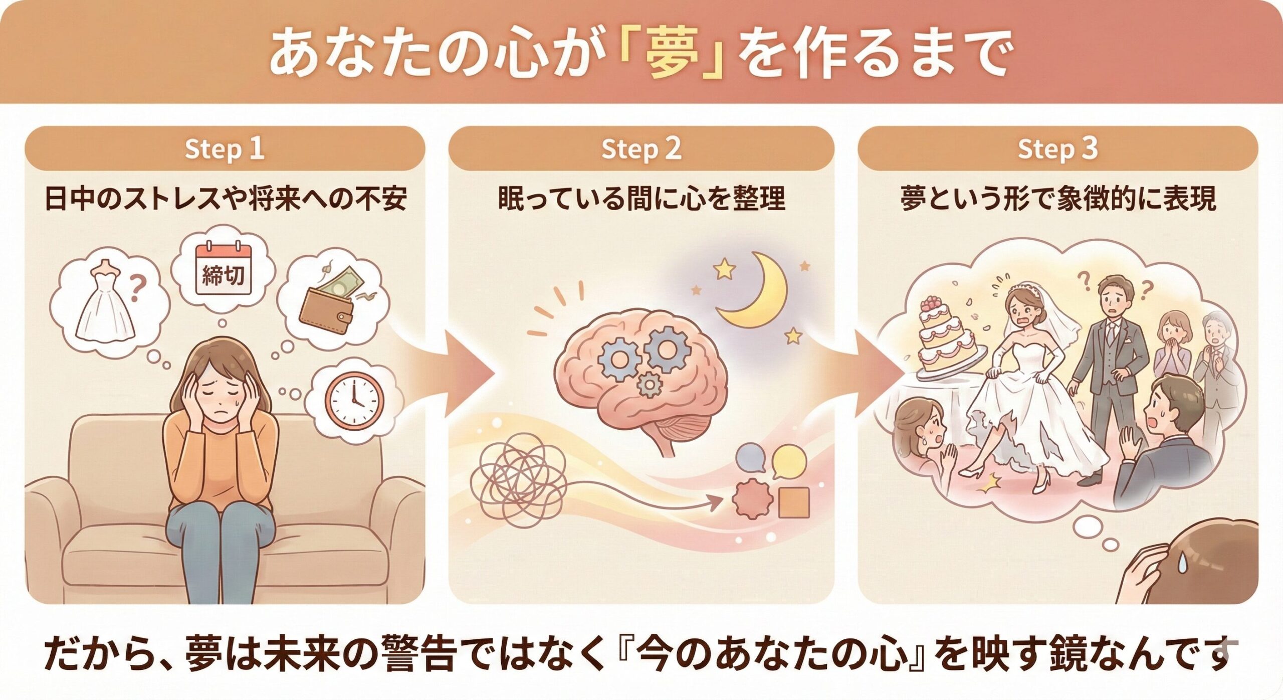 それでは、結婚式の悪い夢の正体とは何なのでしょうか。結論から言うと、その夢は未来からの「警告」ではなく、あなた自身の「深層心理」が送るメッセージです。