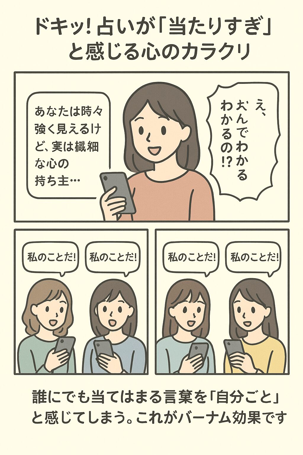 • 「当たりすぎ」と感じる背景には、バーナム効果などの心理が作用しています。