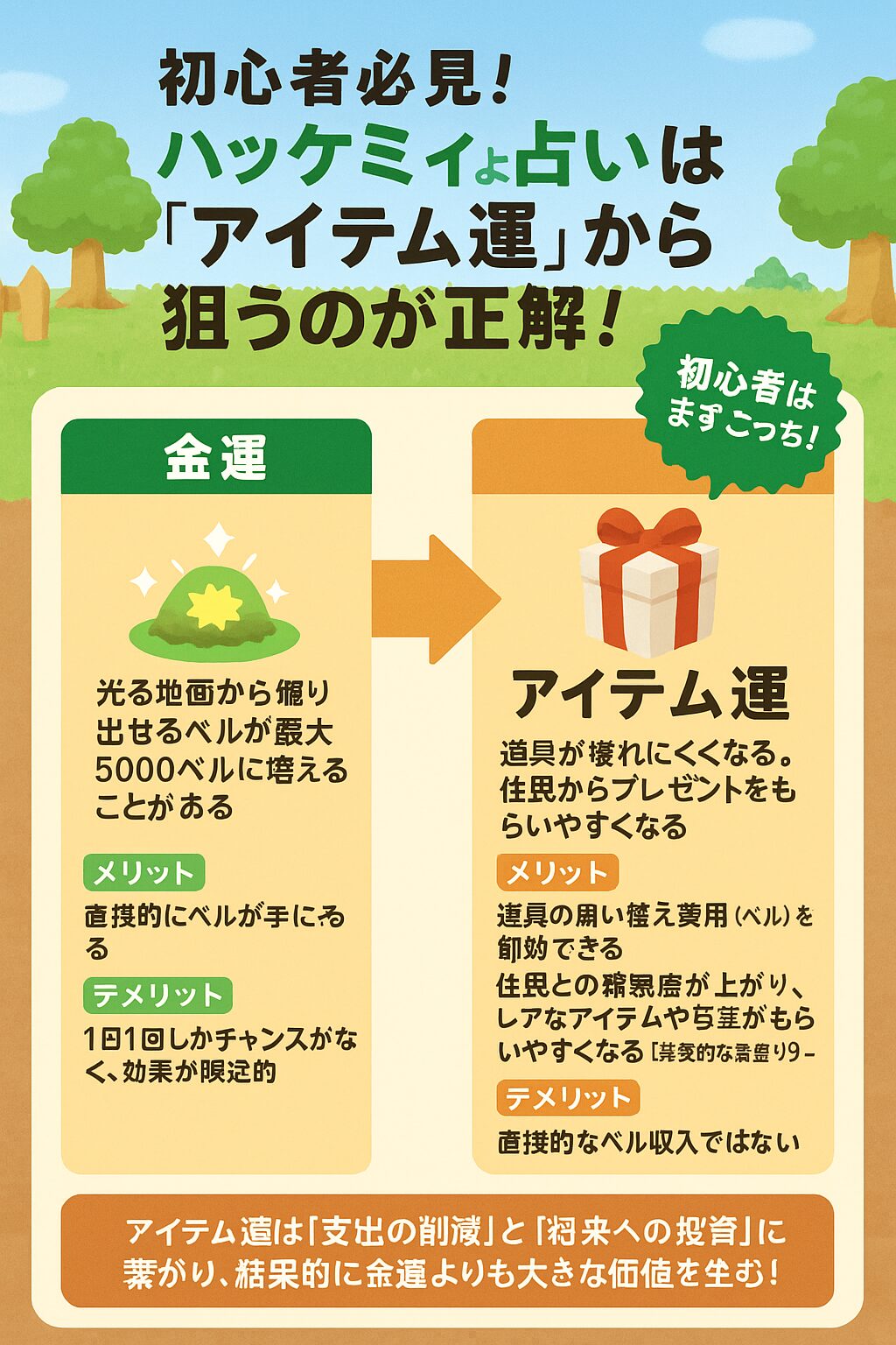 この記事では、あつ森の占い、特に「金運」と「アイテム運」の違いと、それぞれの賢い活用法について解説しました。