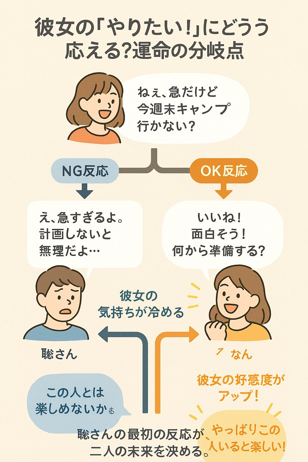 | ① 彼女が急な旅行を提案してきた時 | 「現実的に考えて無理だよ」と正論で否定する。予算やスケジュールの問題点を先に挙げてしまう。 | 「最高だね!そのアイデア、すごく君らしい!」とまず感情を肯定する。その上で「実現するために、何が必要か一緒に考えよう」と協力的な姿勢を示す。 |