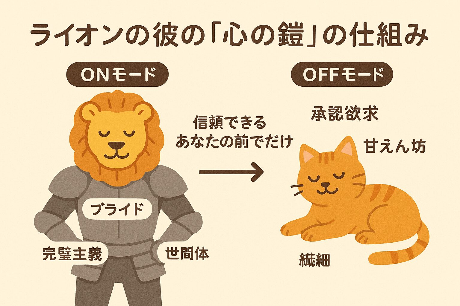 - ONモード(外の顔): 職場や友人の前で見せる、リーダーシップあふれる「百獣の王」の姿。完璧主義で、弱さを見せません。