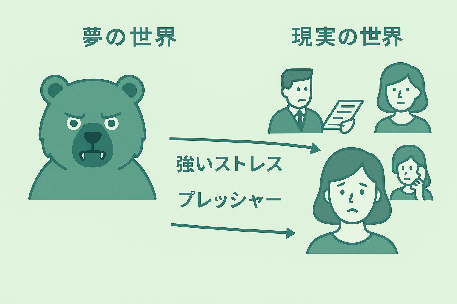 そして、その熊に「襲われる」という夢の状況は、あなたが現実世界で感じている強い「ストレス」や「不安」が、夢という形で表出したものです。 つまり、上司からの過度なプレッシャーや、母親からの干渉といった、心を圧迫する人間関係のストレスが、「熊に襲われる」という攻撃的なイメージに変換されているのです。