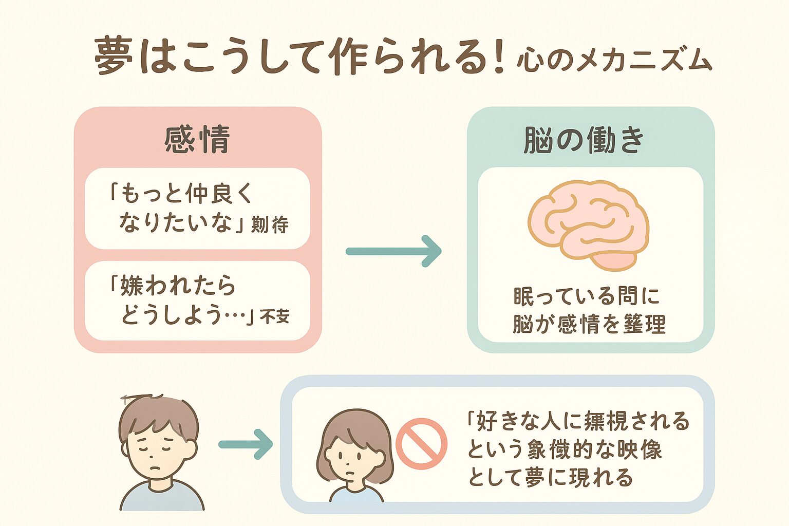 好きな人を思うあまり、「もし嫌われていたらどうしよう」「もっと私のことを見てほしい」といった期待や不安が心の中に生まれるのは、ごく自然なことです。私たちの脳は、眠っている間に、そうした日中の強い感情や情報を整理しようとします。
