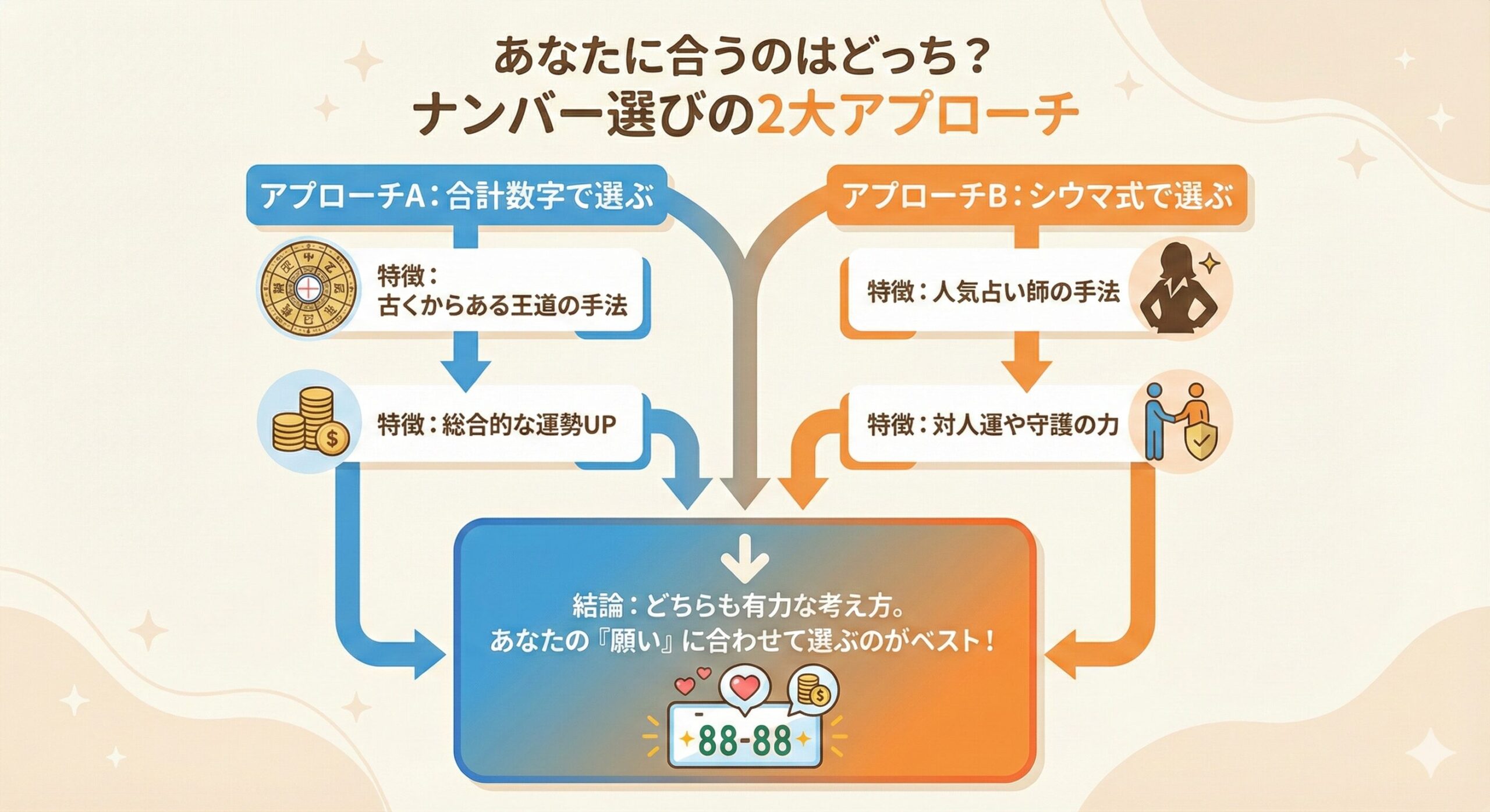 さて、2つの大きな考え方を理解したところで、いよいよあなたのナンバーを決める最終ステップです。UVP(独自の価値提案)として、ここではあなたの「願い事」を基点に、どちらのアプローチからどの数字を選ぶべきかを具体的に提案します。