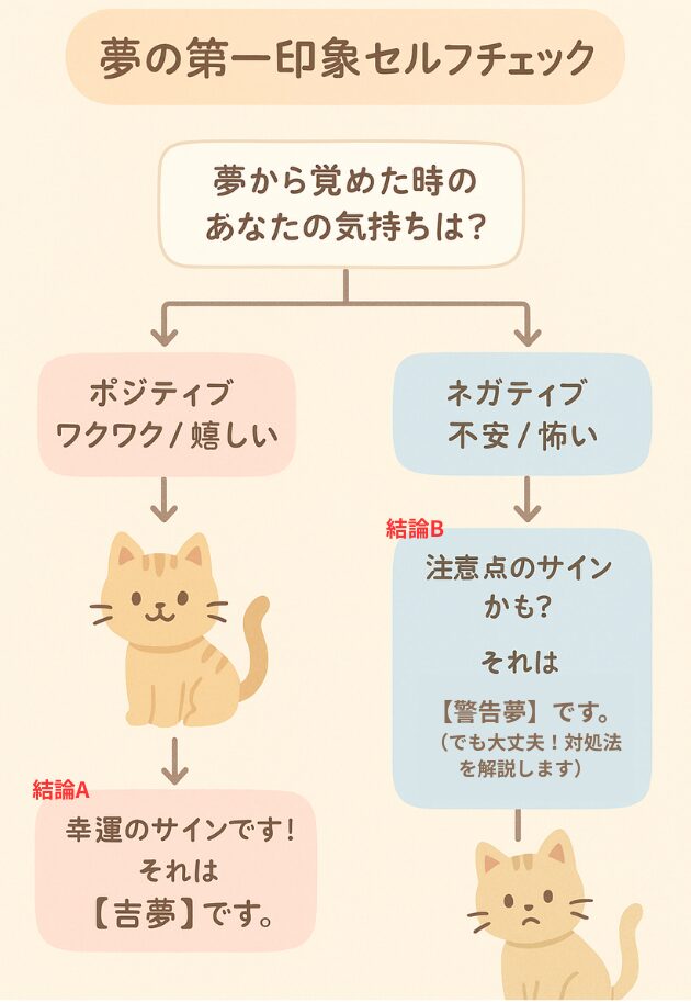 まずは、あなたが見た夢がどちらのタイプなのか、簡単なフローチャートで確認してみましょう。
