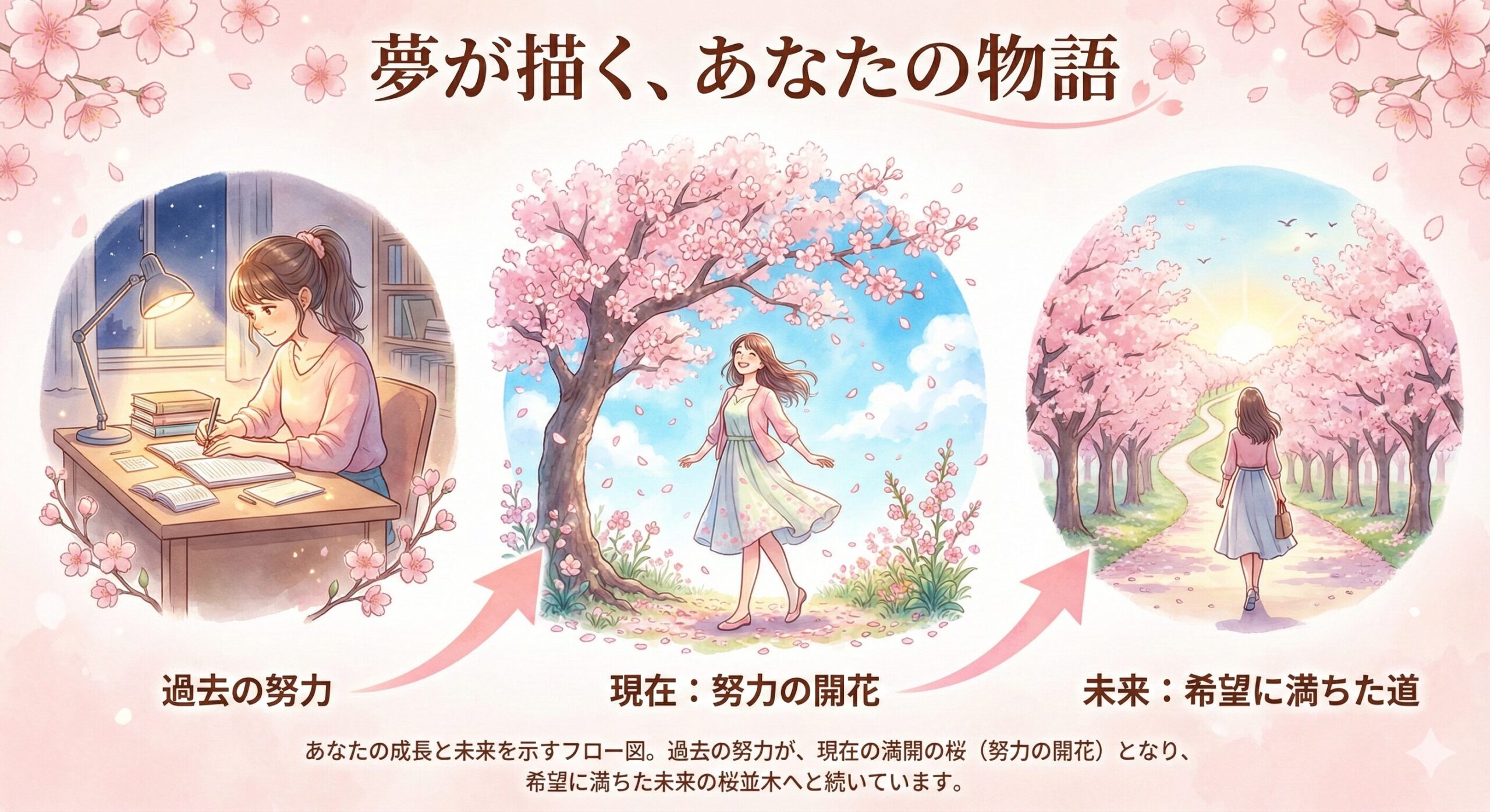 あなたの未来は、あの夢で見た桜並木のように、明るく、美しく続いています。
