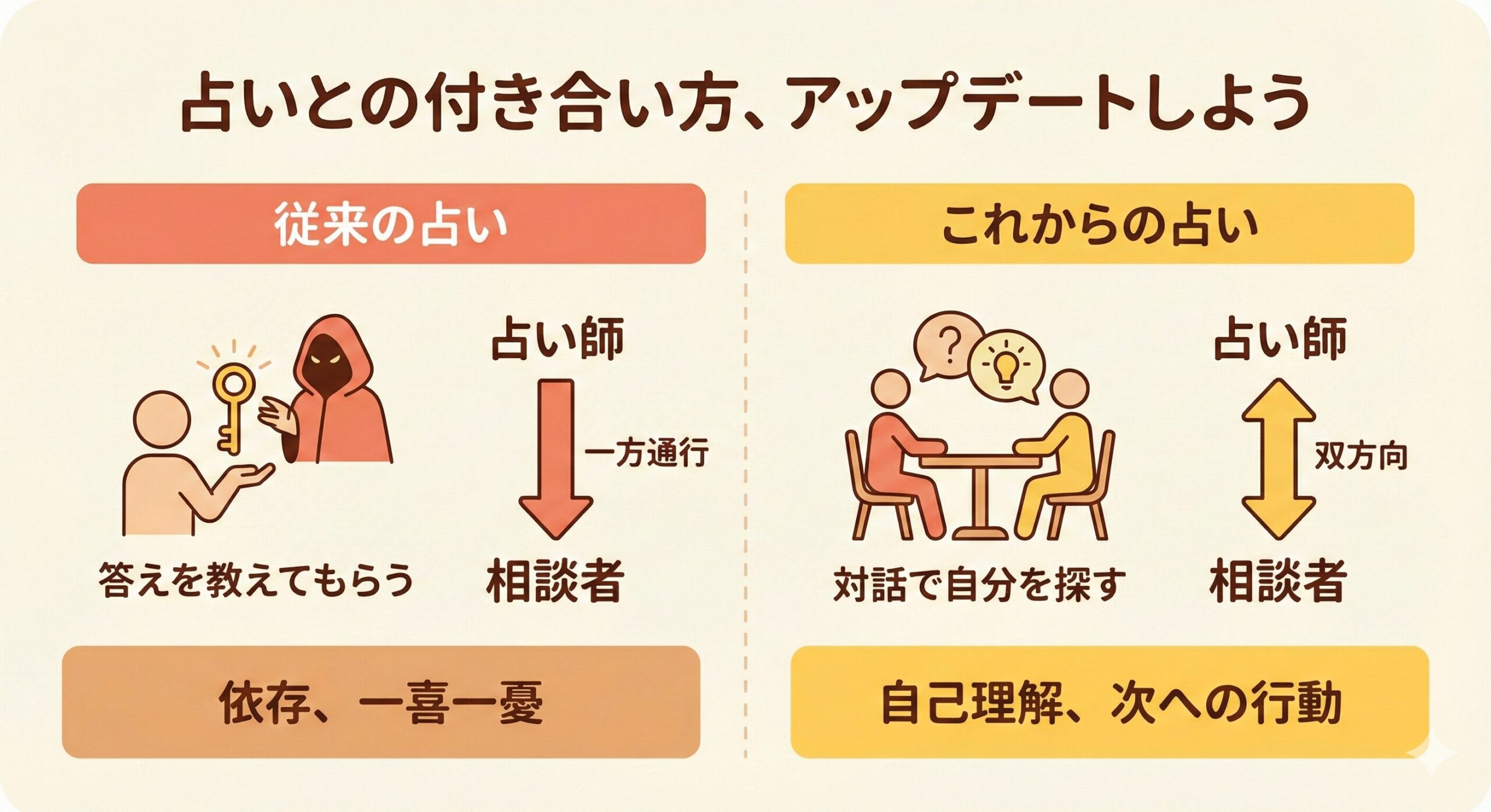 これからの時代の占いとの付き合い方も、まさにこれと同じです。未来を断定する人を探すのではなく、あなたの複雑な気持ちを丁寧に紐解き、未来への選択肢を一緒に考えてくれる人を探すこと。