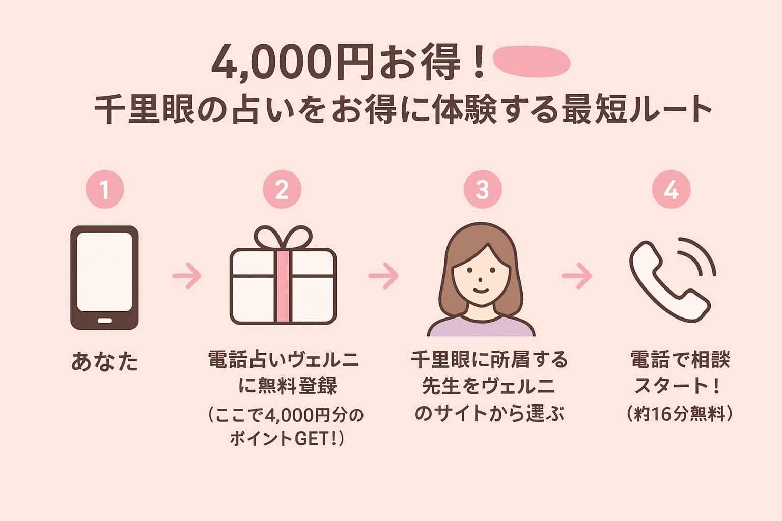 - 千里眼の電話占いは、提携先の「電話占いヴェルニ」経由で、初回4,000円分お得に試すのが最も賢い方法です。