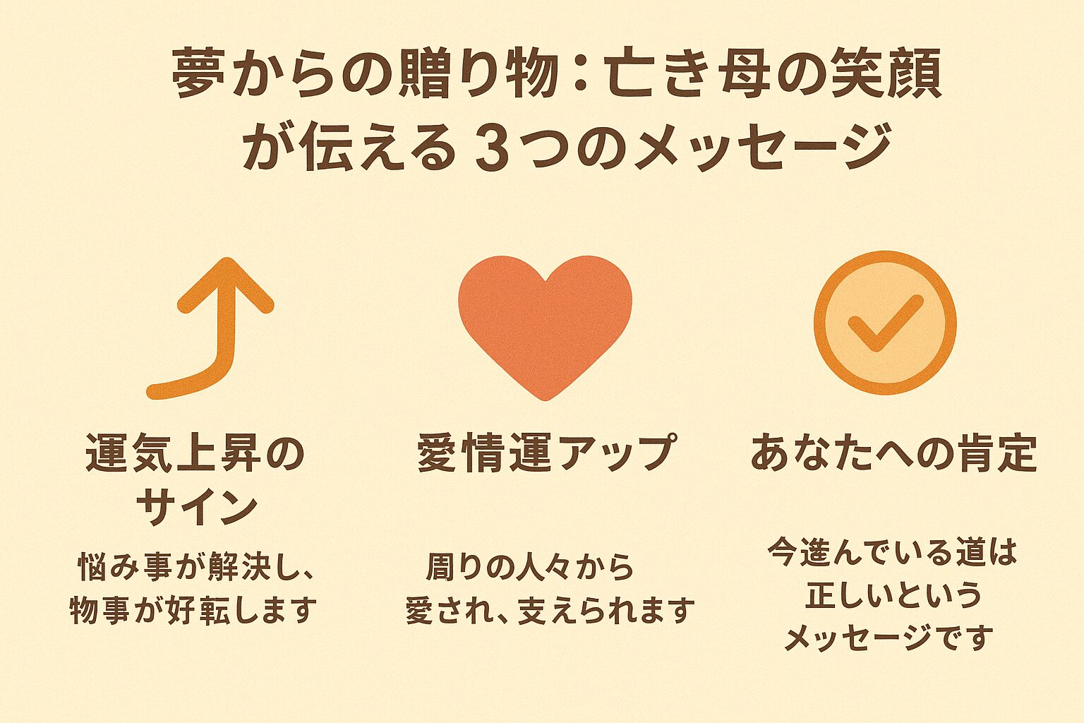 つまり、亡くなったお母様が笑顔でいる夢は、「あなたの進む道は間違っていないよ」「これからもあなたを愛情を持って見守っているよ」という、非常に力強く、温かい肯定のメッセージなのです。運気が上昇し、対人関係が良好になるなど、あなたの人生が良い方向へ向かうことを示唆しています。