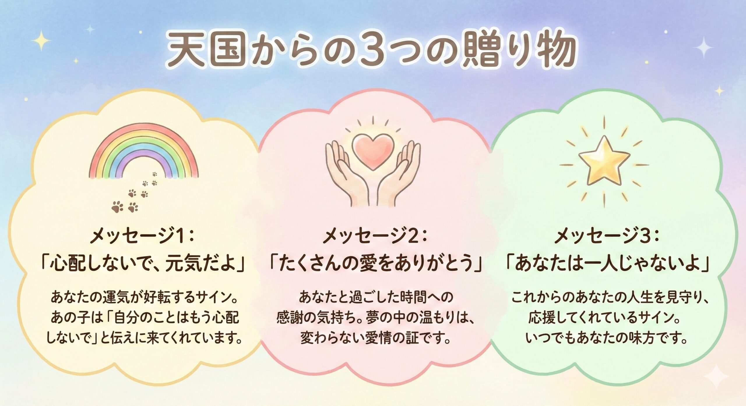 それでは、亡くなったペットを撫でる夢が、具体的にどのようなメッセージを伝えているのか見ていきましょう。夢占いは、亡きペットからの大切なメッセージを読み解くための一つの手段と考えることができます。特に、夢の中のペットが元気だったり、穏やかな表情をしていたりする場合、その夢は「吉夢」と呼ばれ、以下の3つのポジティブなメッセージを伝えていると考えられます。