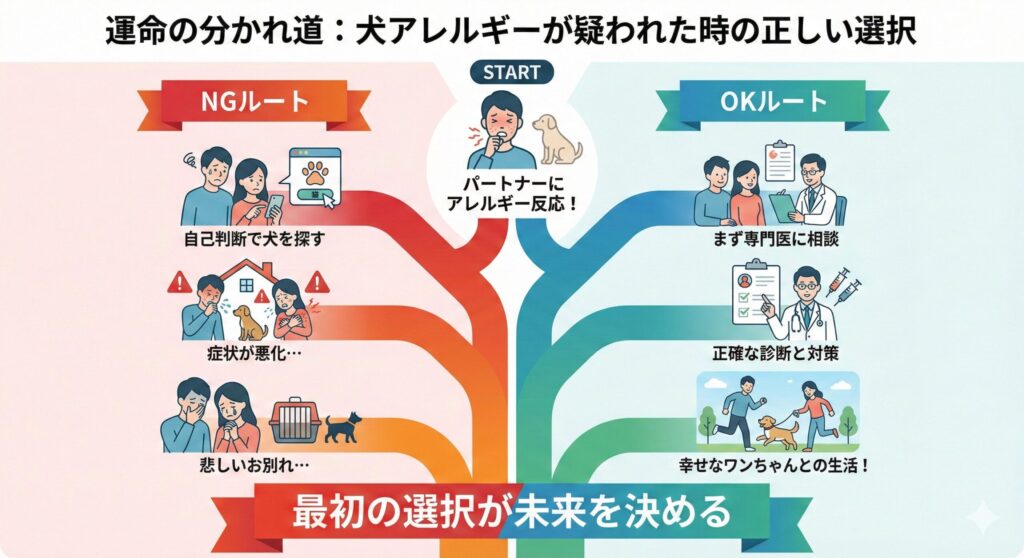【結論】: 今すぐ取るべき行動は、犬種を調べることではなく、パートナー(ご主人)がアレルギー専門医を受診することです。