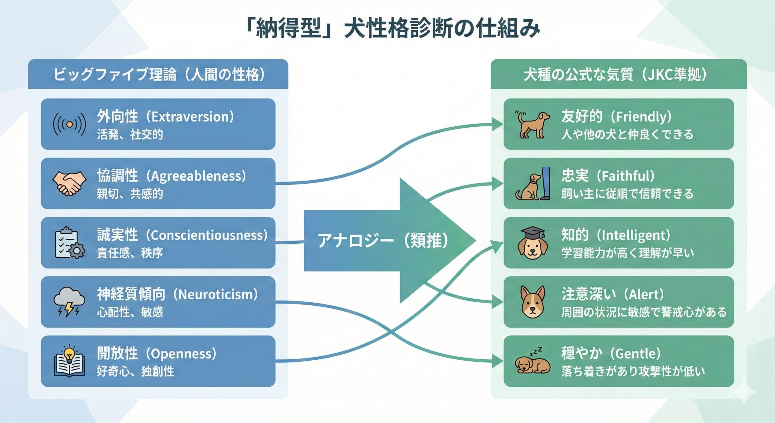 この人間の性格を測るビッグファイブ理論と、犬の公式な気質は、アナロジー(類推)によって対応付けることが可能です。この2つを組み合わせることで、「あなたの『協調性』の高さは、人懐っこく穏やかなゴールデン・レトリーバーの公式な気質と共通します」といった、根拠のある分析が初めて可能になります。