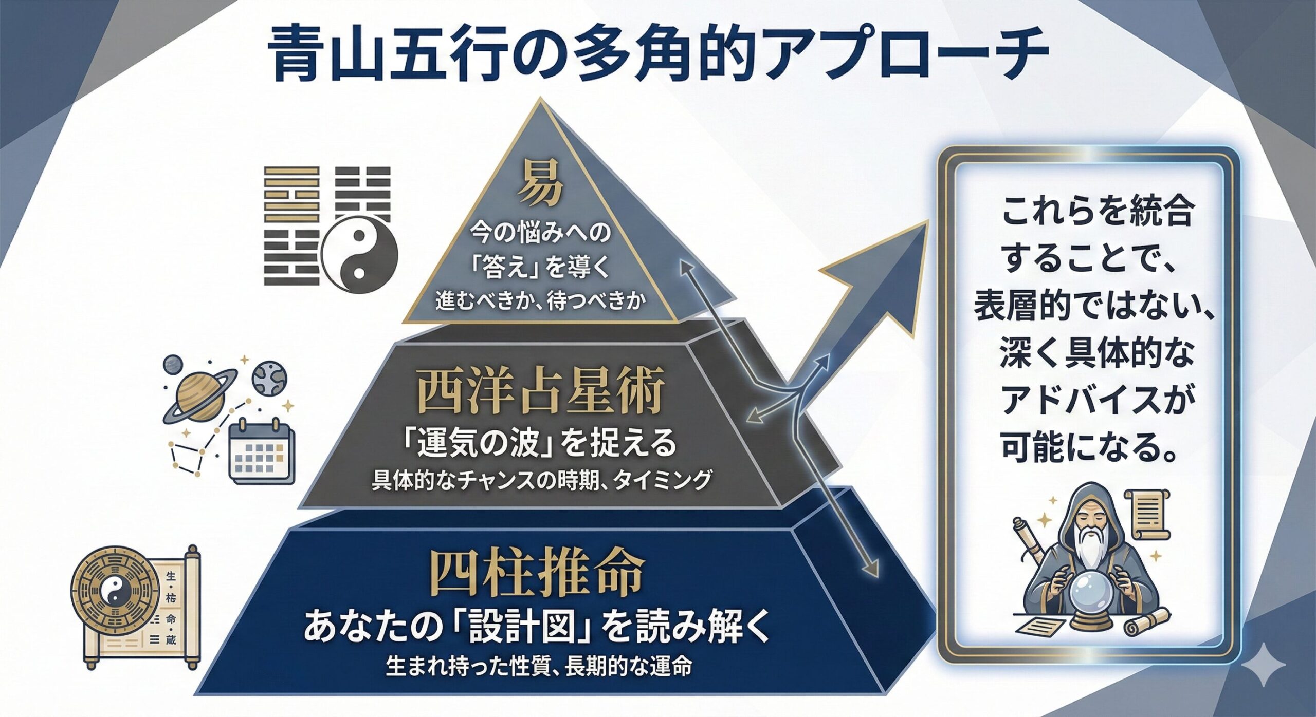 その信頼性の根幹にあるのは、創始者である小池雅章氏が開発した独自の占術にあります。青山五行は、一つの占術に頼るのではなく、複数の伝統的な占いを統合し、多角的な視点から鑑定を行う点に最大の特徴があります。