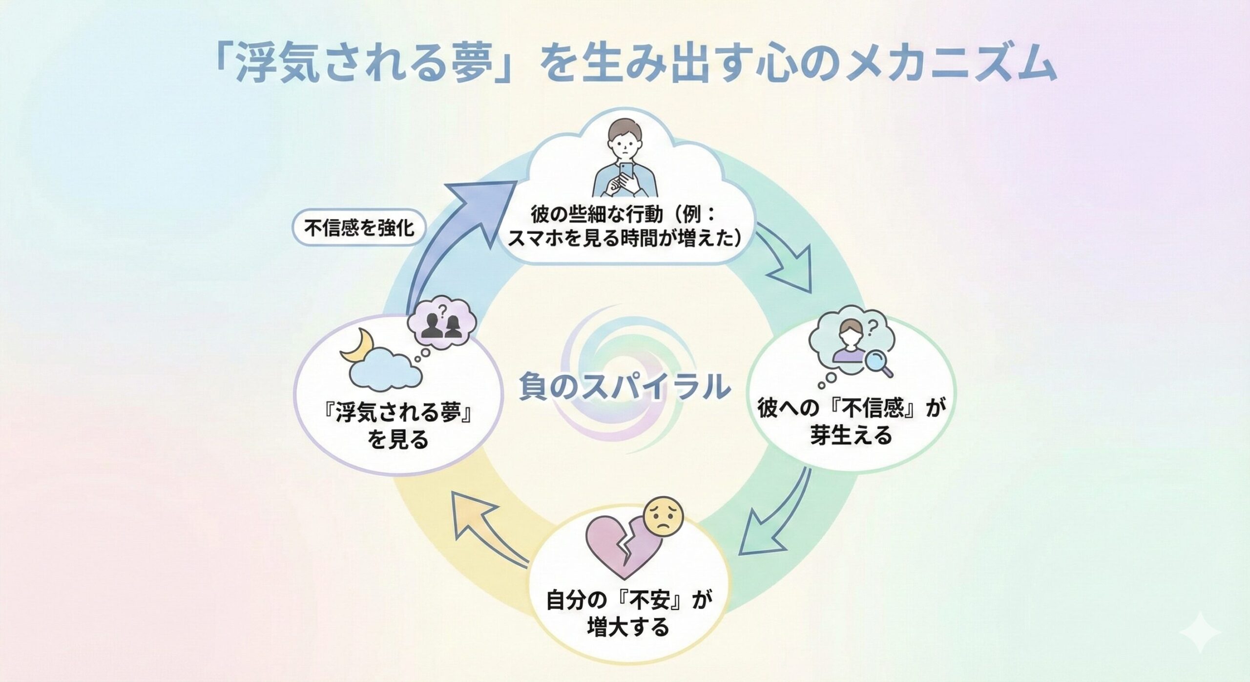 具体的には、現実での些細な出来事から生まれた彼への不信感が、あなたの不安を増幅させます。そして、増幅された不安は、さらに彼の行動を疑いの目で見てしまう原因となり、不信感をより一層強固なものにしてしまうのです。この負のループこそが、浮気される夢を繰り返し見せてしまう正体です。