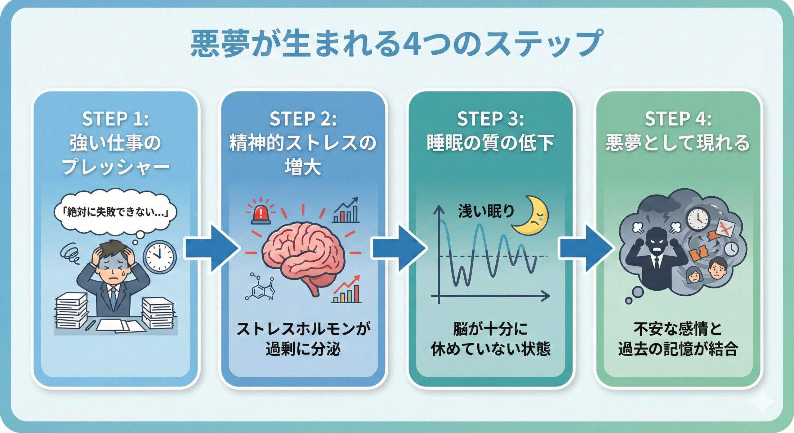 そして、この睡眠の質の低下こそが、悪夢を引き起こす主な引き金なのです。