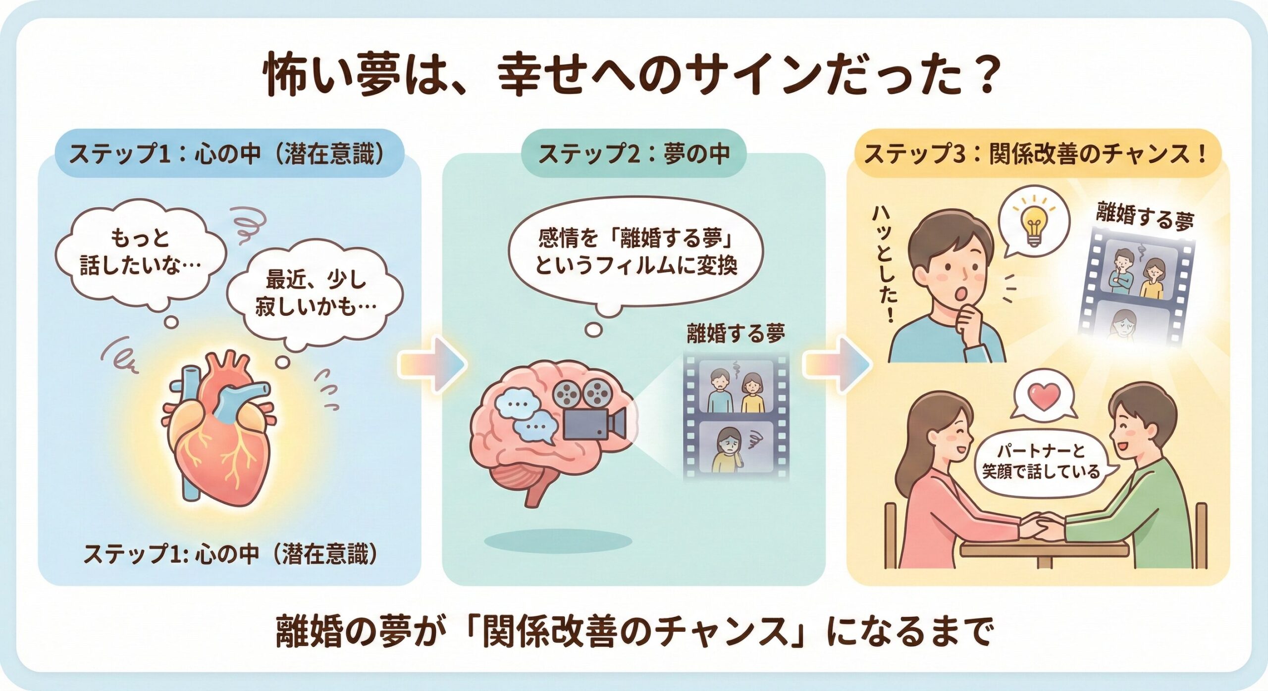 特に、パートナーとの間に生まれた、言葉にならないほどの小さなすれ違いや、コミュニケーション不足への寂しさといった感情は、日中の意識している間は心の奥に押し込められています。そうした深層心理にある感情が原因となり、睡眠中に脳が情報を整理する過程で、「離婚」という分かりやすいストーリーに変換された結果が、今回あなたが見た夢なのです。
