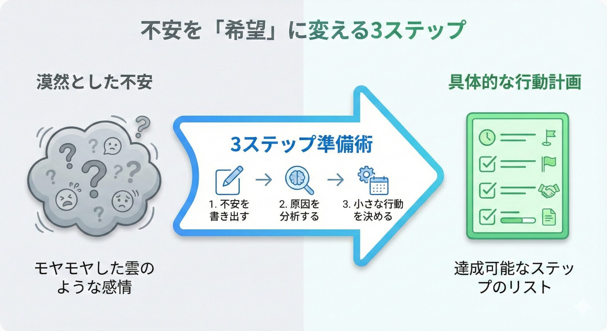 - 漠然とした不安は、具体的な行動計画に落とし込むことで、自信に変えることができます。