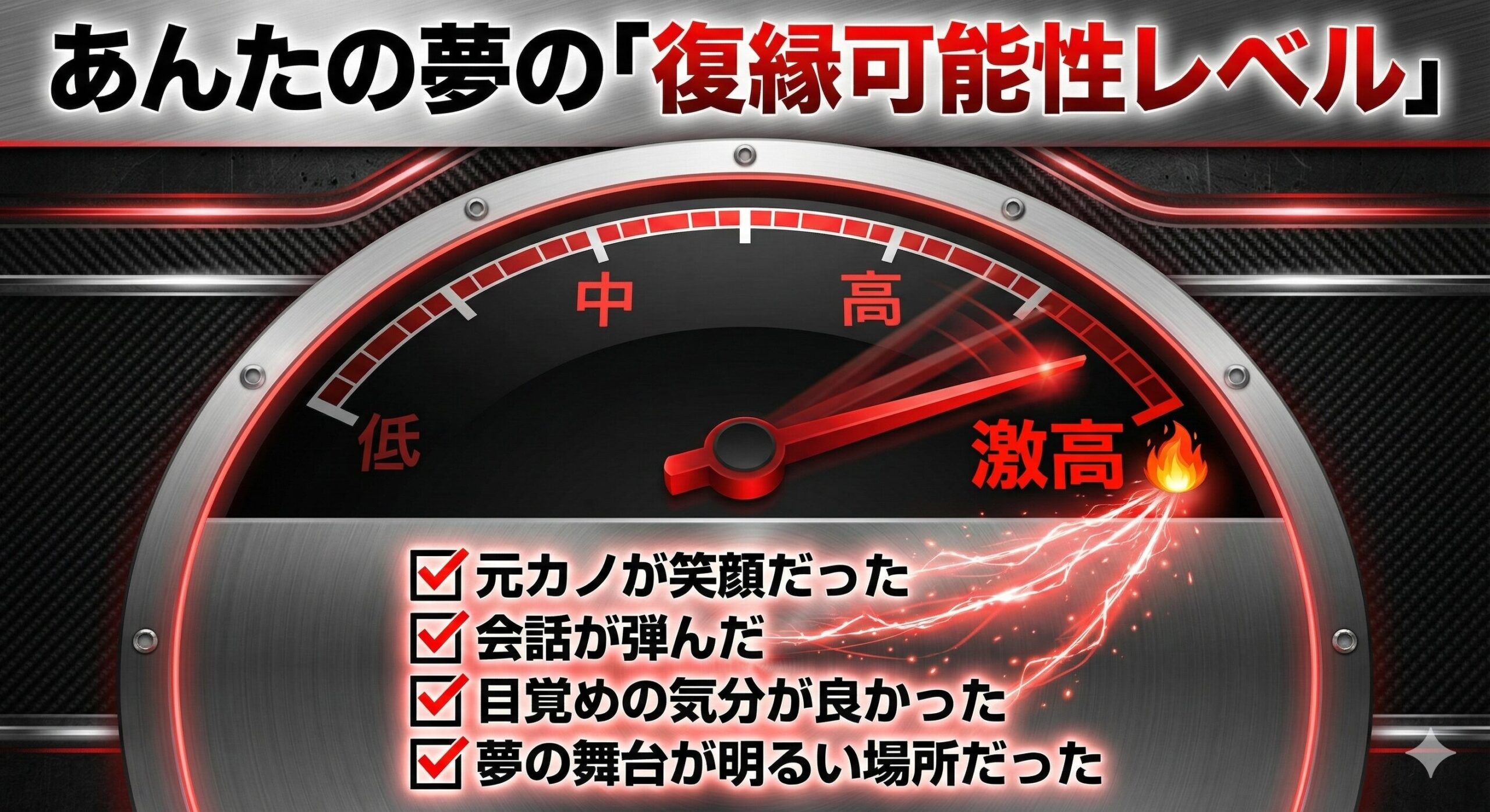 だが断言する。あんたが見たその夢は、復縁の可能性がかなり高いことを示す「吉夢」だ。