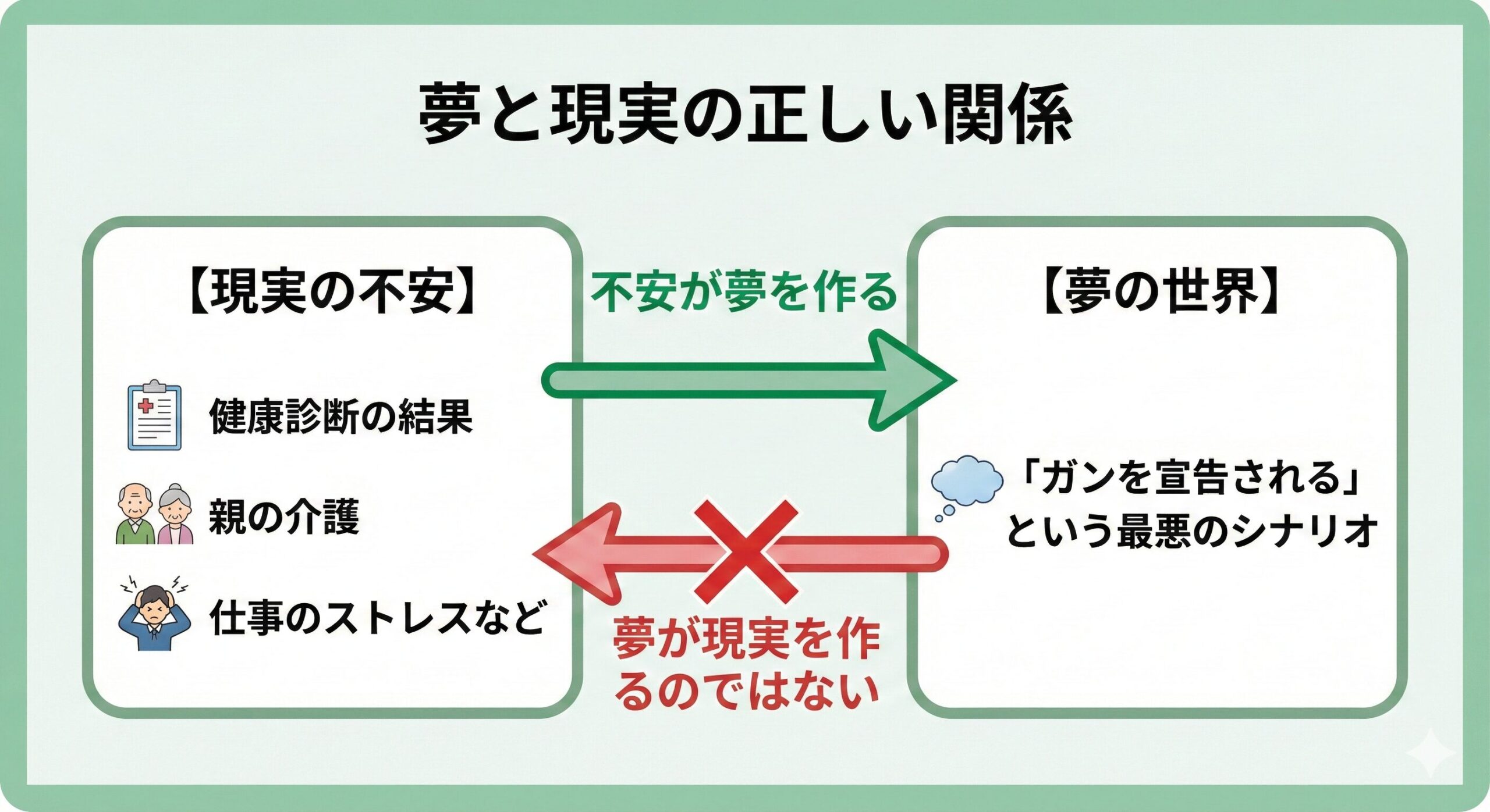 特に、健康診断の結果を待つような健康不安を抱えている時、私たちの心は無意識のうちに「最悪の事態」を想定してしまいます。その、あなたが日中に必死で打ち消している心理状態が、心の抵抗力が弱まる睡眠中に、最も恐れている「ガンを宣告される」という形で映像化されてしまうのです。