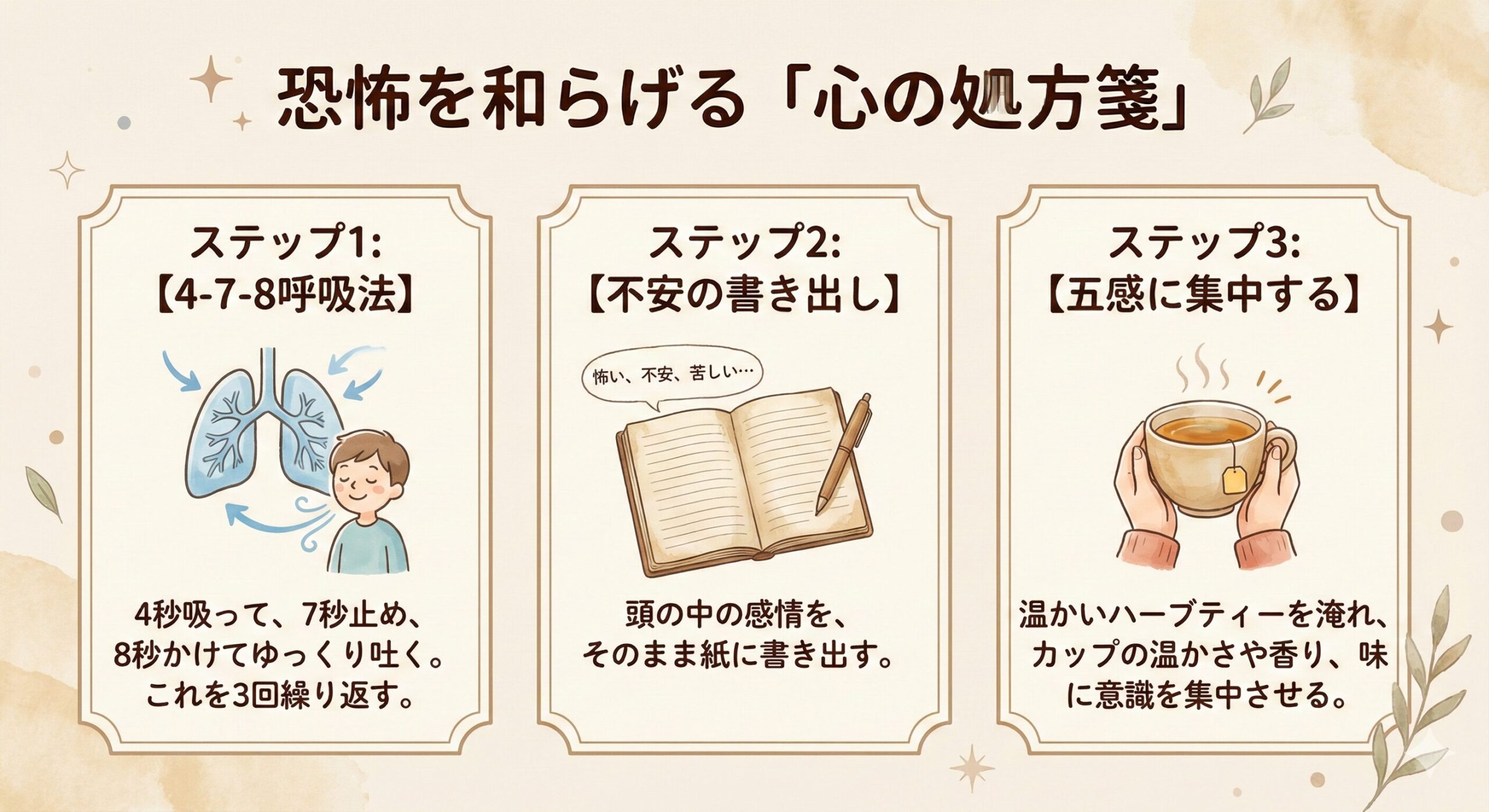 そこで、今、この場でできる、心を落ち着けるための具体的な「心の処方箋」を3つご紹介します。