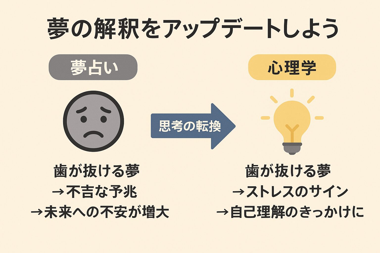 従来の夢占いが曖昧で不安を煽る解釈を提供しがちなのに対し、現代心理学は、歯が抜ける夢を自己理解のための貴重な情報源と捉えます。その夢の根本的な原因はストレスであり、夢はあなたに大切なメッセージを伝えようとしています。