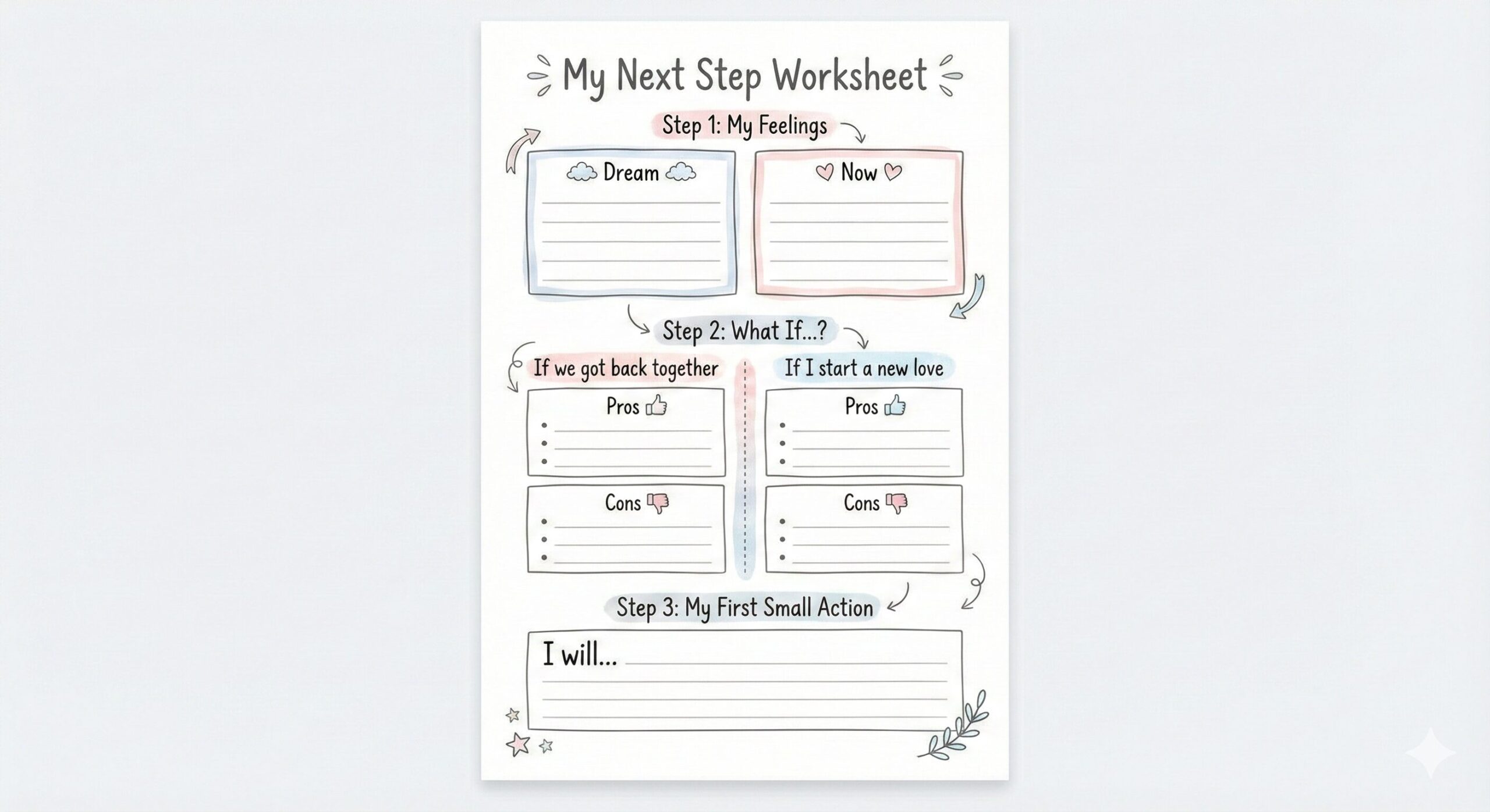 最後に、Step2の分析を踏まえて、今の自分にできる「小さな一歩」を一つだけ決めましょう。大切なのは、大きな決断ではなく、すぐに実行できる小さな行動です。- 復縁の可能性を探りたいなら: 「別れた原因を冷静に分析する」「自分磨きのために美容院を予約する」