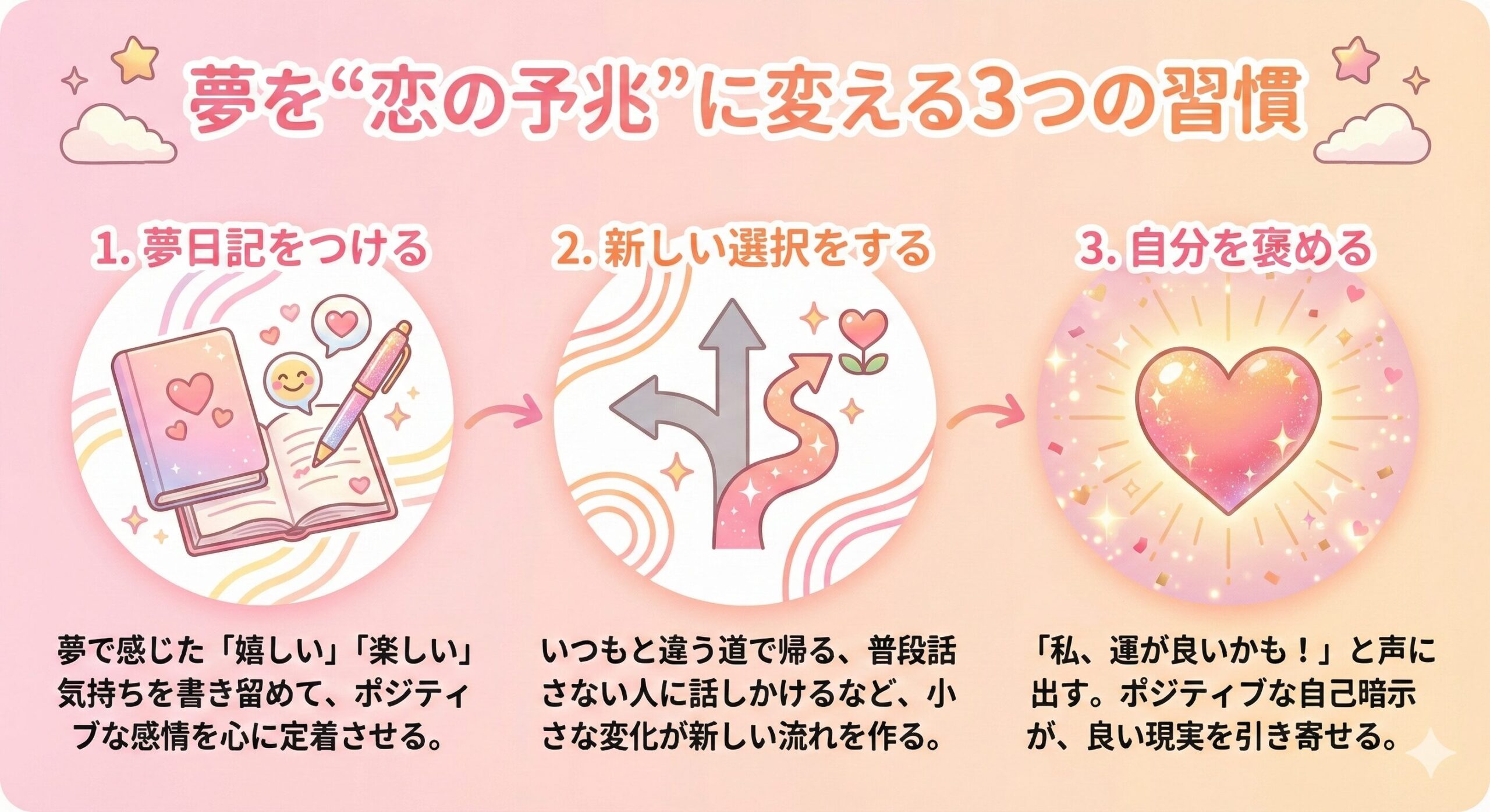 せっかくの吉夢も、見て満足するだけではもったいない! 夢がくれたポジティブなエネルギーを現実に繋げる、今日からできる3つの簡単な習慣をご紹介します。