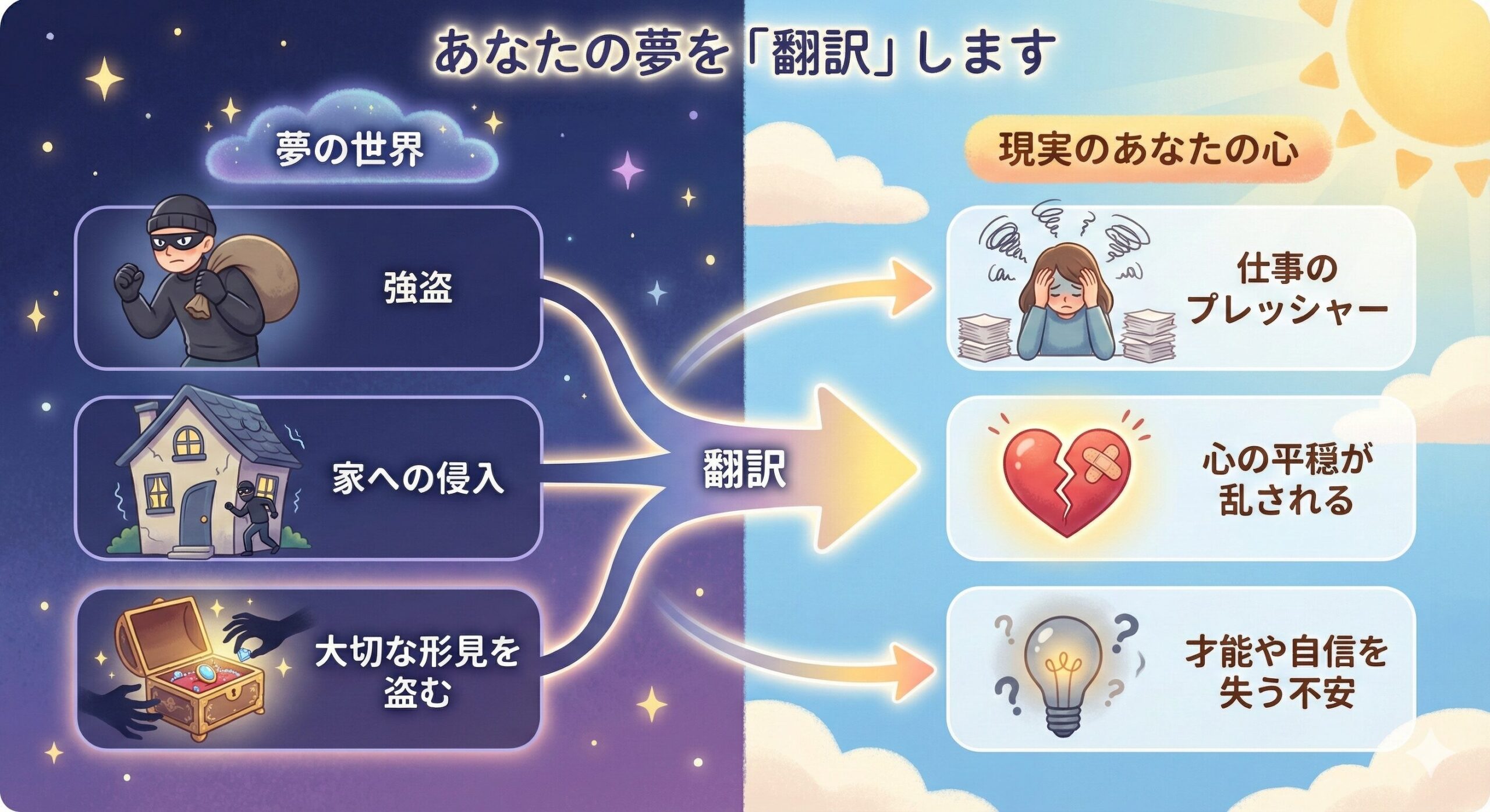 夢は、未来に起きることではなく、今あなたが感じていることを映し出します。特に、強盗のような衝撃的な夢は、あなたが現在抱えている強いストレスや不安が、ドラマチックな映像として表現されたものに過ぎません。