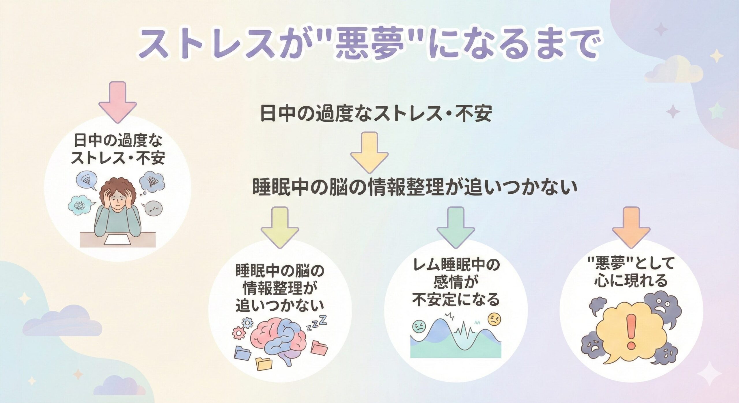 私たちの脳は、眠っている間(特にレム睡眠中)に、日中に起きた出来事や感情を整理しています。しかし、仕事のプレッシャーや対人関係の悩みなどで強いストレスがかかると、脳の情報処理が追いつかなくなります。その結果、処理しきれなかった不安や恐怖といったネガティブな感情が、断片的なイメージとして夢に現れるのです。これが、悪夢の正体です。