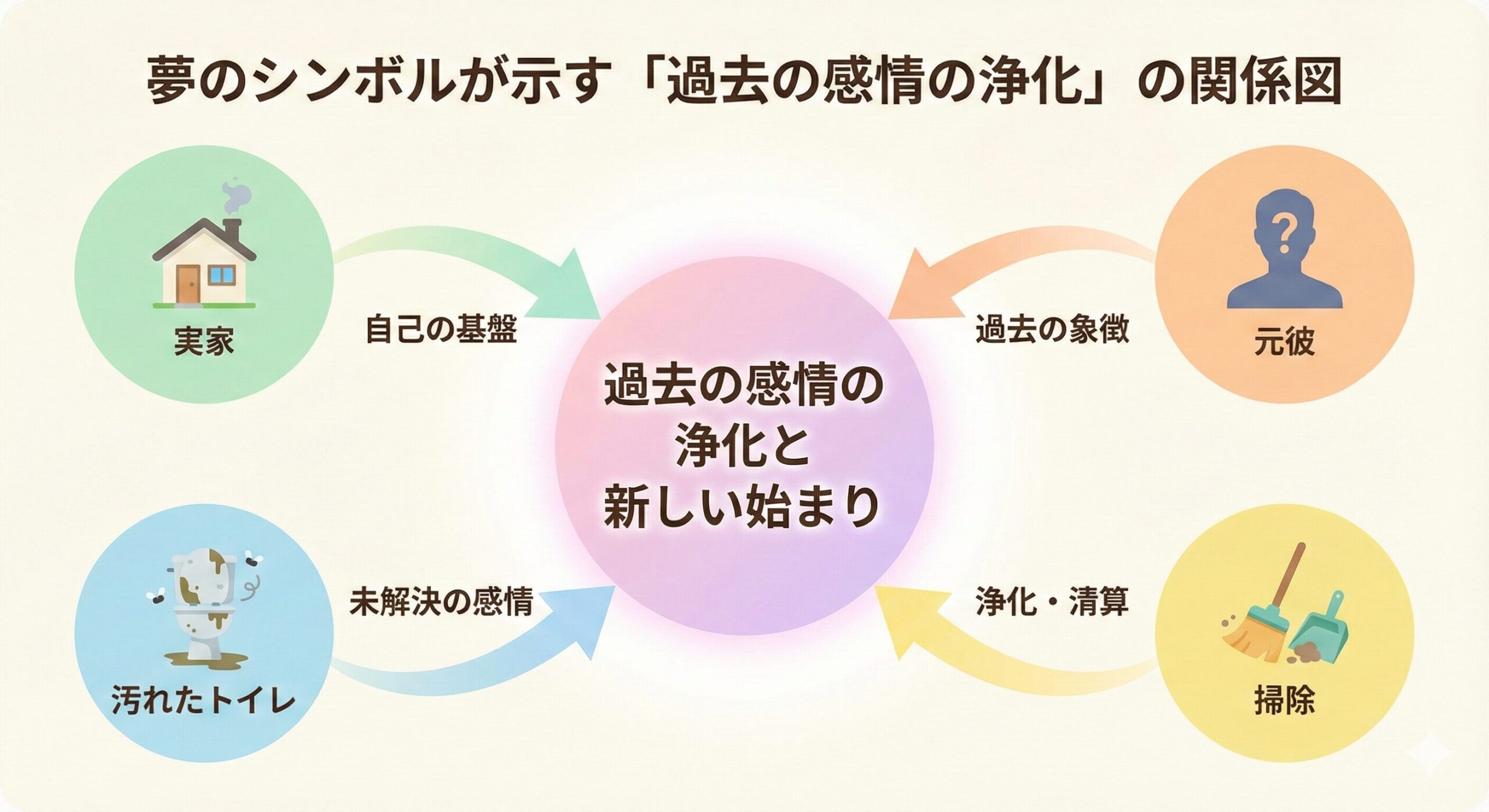 夢の舞台である「実家」は、自己の基盤やルーツを象徴します。その場所で「元彼」という過去の人間関係や価値観の象徴が、「汚れたトイレ」という未解決の感情やストレスを「掃除」、つまり浄化・清算しているのです。