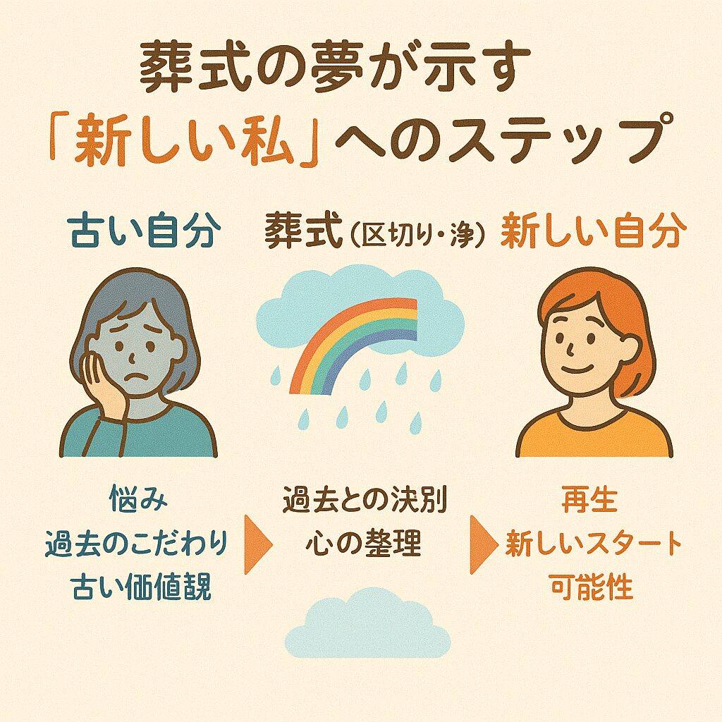 私たちの心は、成長の過程で、もう不要になった価値観や過去のこだわり、コンプレックスなどを手放す必要があります。古い価値観や過去の自分を手放すこと(象徴的な死)が、新しい自分への再生(誕生)を引き起こすのです。この「終わりと始まり」のプロセス全体を、葬式の夢はドラマチックに描き出しています。