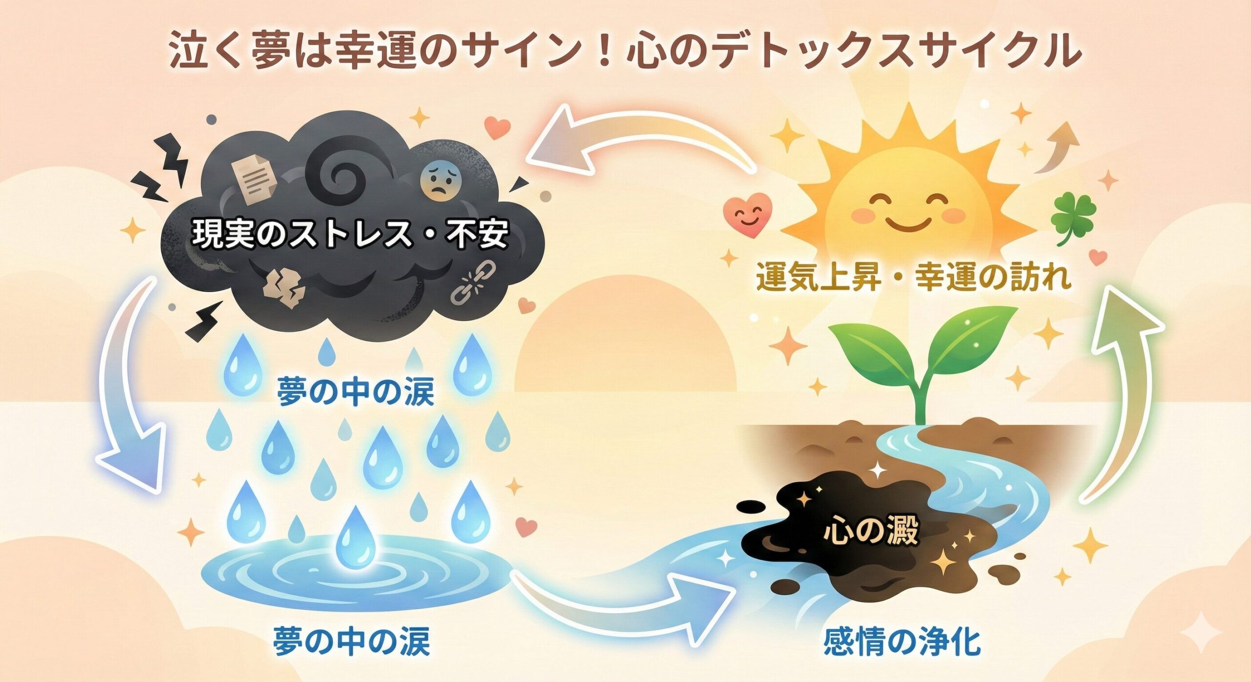 現実世界での不安やストレスは、心の中に澱(おり)のように溜まっていきます。この心の澱が、原因となって泣く夢を見せることがあります。夢の中での涙は、この澱を洗い流す機能・効果を持っており、これを「感情の浄化」と呼びます。心が浄化されることで、現実世界の問題に対しても前向きに取り組むエネルギーが湧いてくるのです。