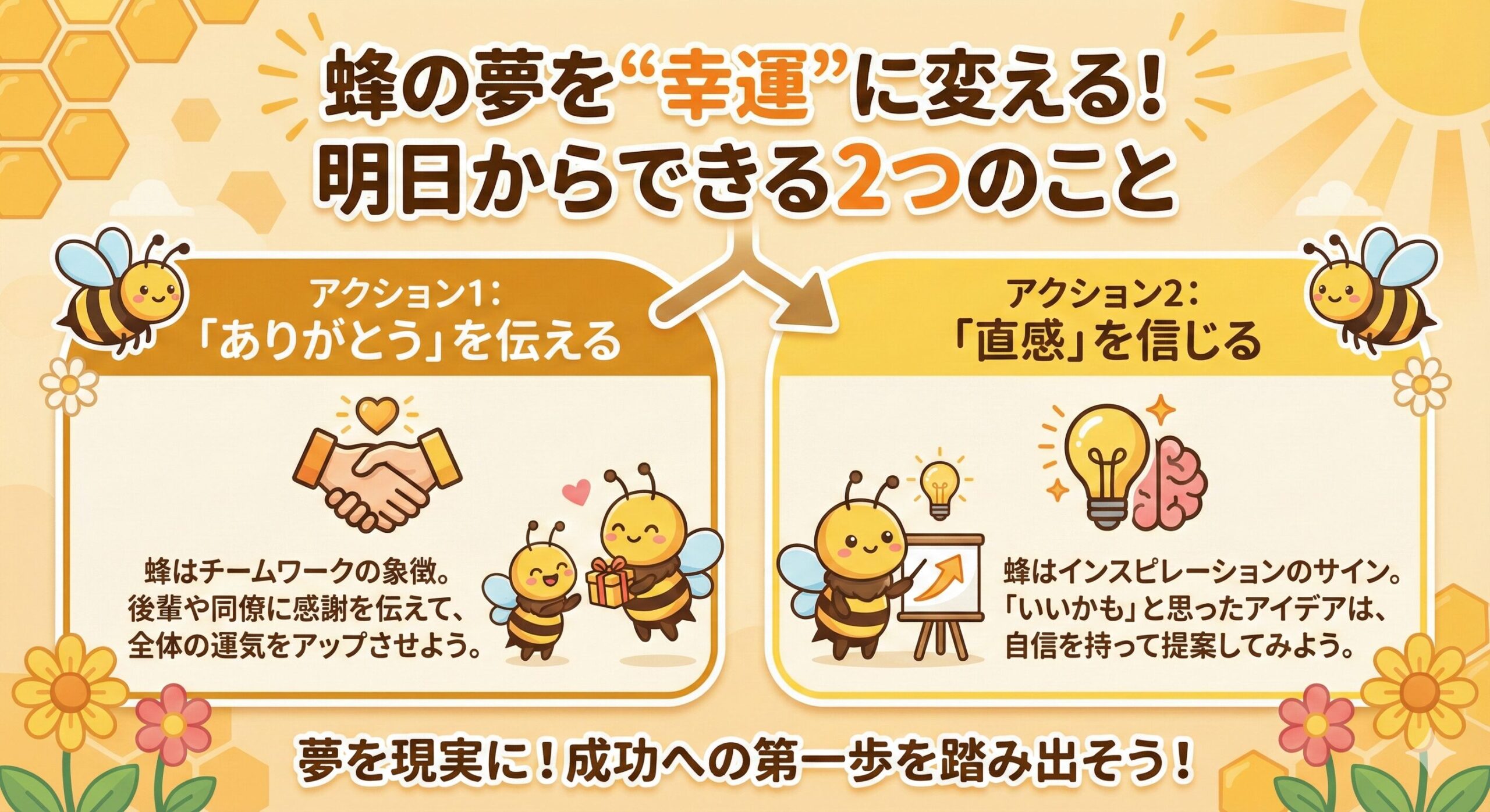 蜂は、時にインスピレーションの象徴としても現れます。仕事の中で「こうした方がもっと良くなるかも」と感じた、あなたの小さなアイデア。それを、「まだ自信がないから…」としまい込まずに、勇気を出して発言してみましょう。夢が、あなたの直感が正しいと応援してくれています。