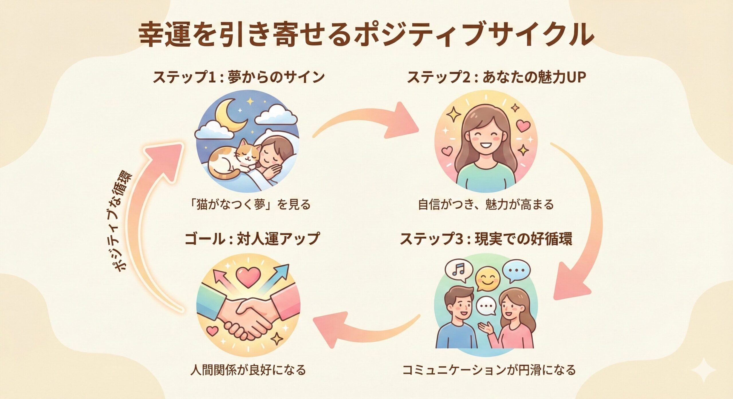 その猫が、あなたに心を開いて「なつく」というポジティブな行動は、現実世界での人間関係が好転することに直結します。つまり、猫がなつく夢は吉夢の一種であり、その夢は対人運アップを引き起こす、という明確な因果関係があるのです。