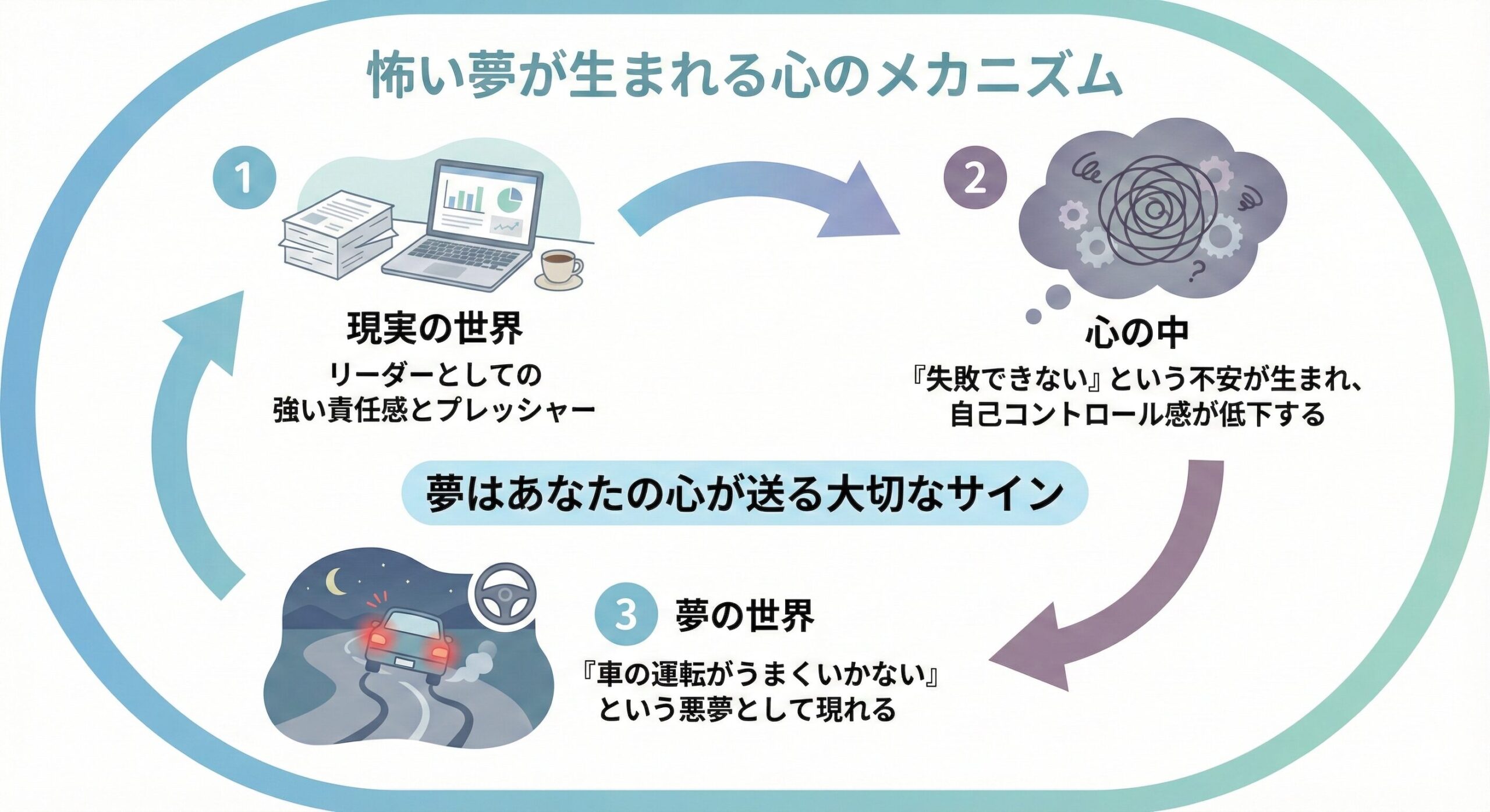 この関係性を踏まえると、あなたが感じているプレッシャーが不安を生み出し、その不安が「物事をうまく自己コントロールできていない」という感覚に繋がっていることがわかります。この心のメカニズムが、夢の世界で「車の運転がうまくいかない」という具体的なイメージとして現れるのです。