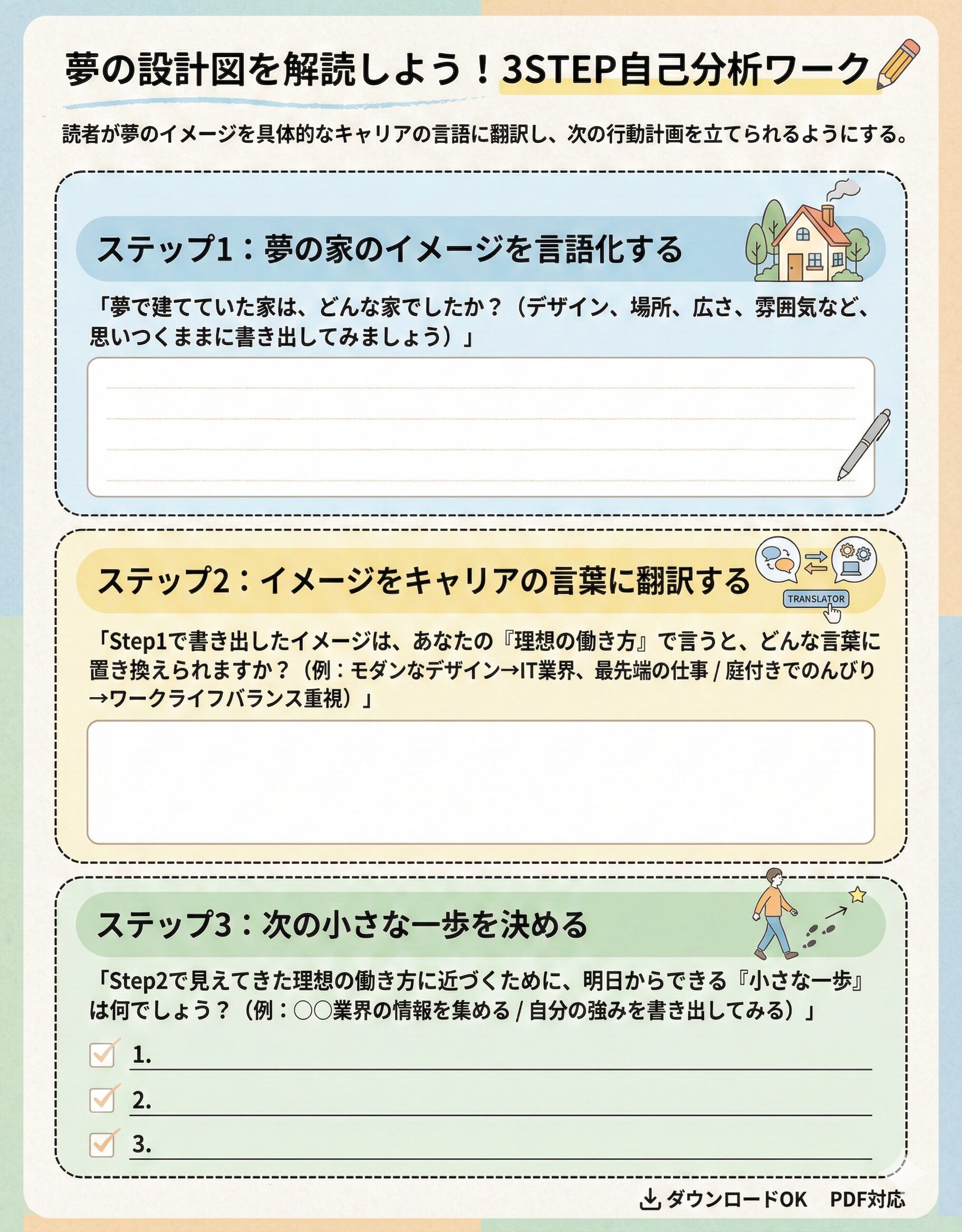 では、その素晴らしい「可能性」を、具体的にどうキャリアプランに活かしていけば良いのでしょうか。夢占いを、あなただけの「自己分析」ツールとして活用するための、簡単な3ステップのワークをご紹介します。ぜひ、ペンと紙をご用意して、取り組んでみてください。
