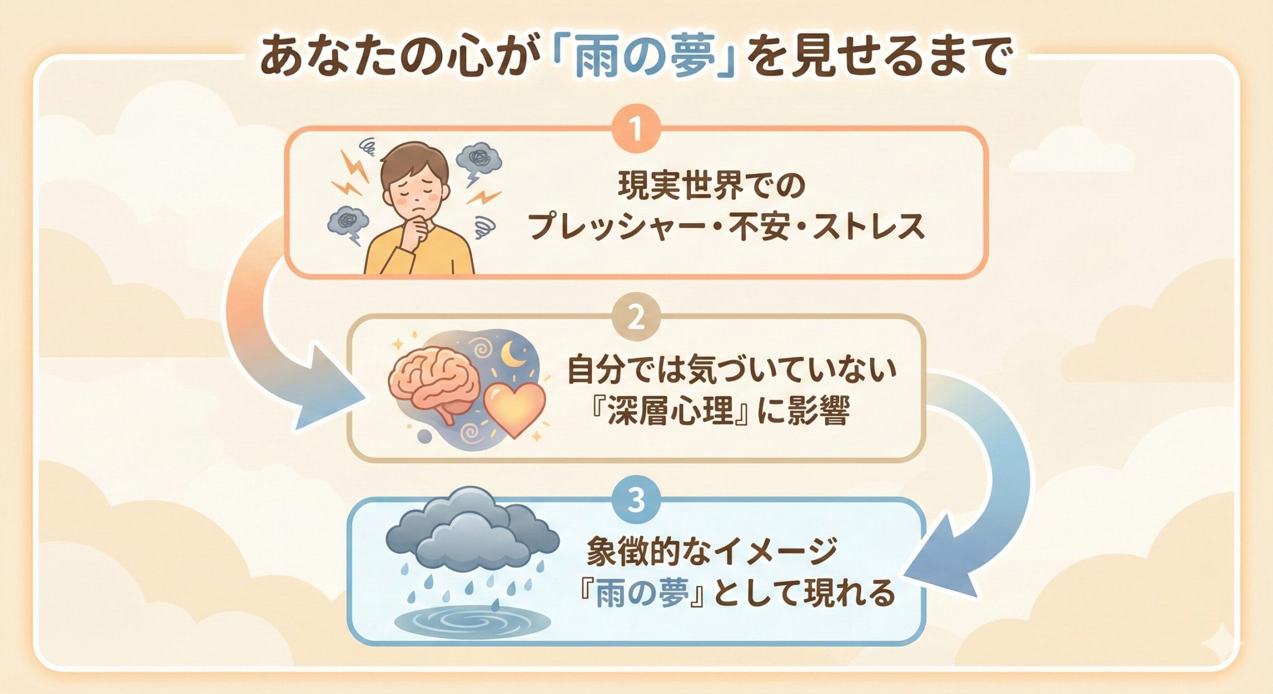 これは、私がカウンセリングの場で本当によくお受けするご質問の一つです。多くの方が、雨の夢、特にそれが激しい土砂降りや雷雨であった場合、強い不安を感じて相談に来られます。