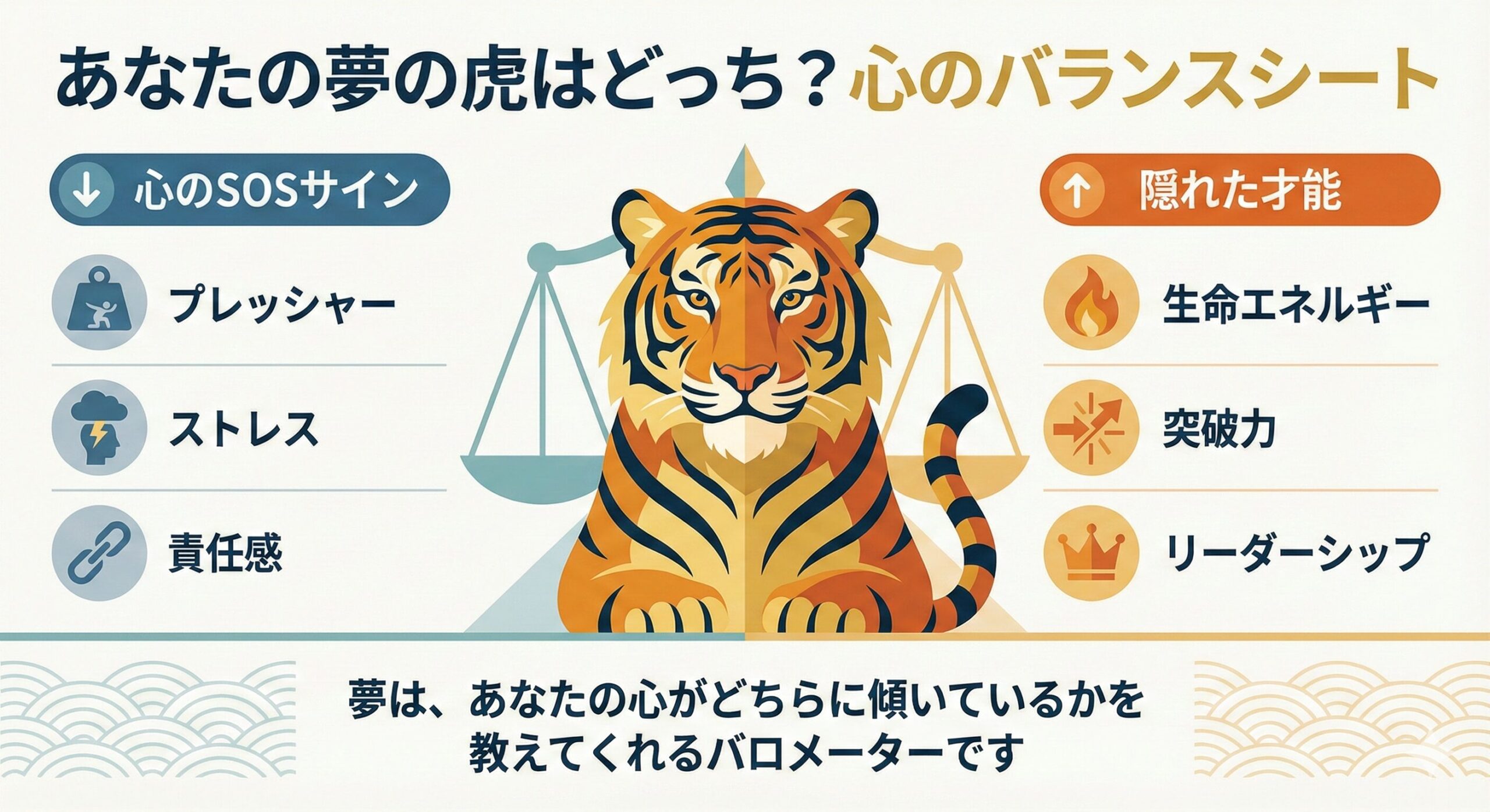さて、ここからは少し視点を変えて、専門家として解説します。夢占いにおいて虎というシンボルは、あなたが感じている「プレッシャー」が具現化したものであると同時に、それだけではありません。