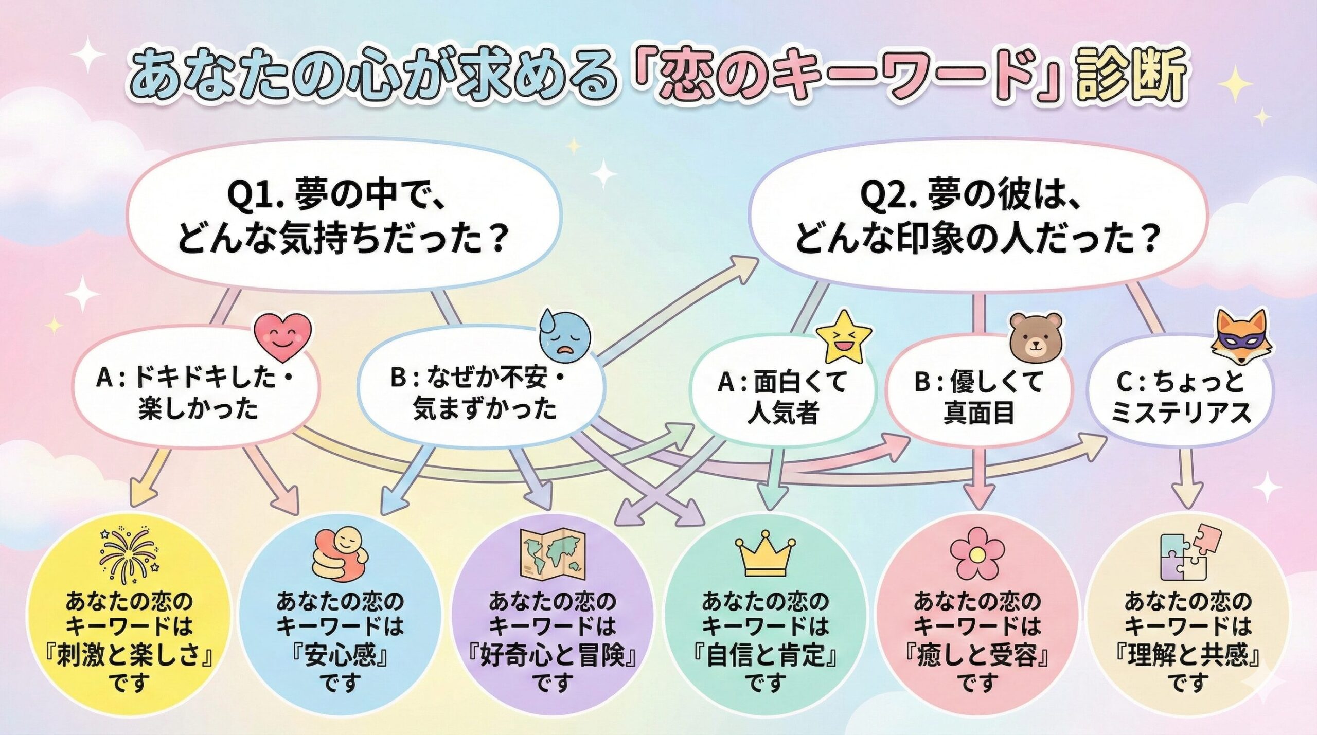 この記事では、単なる夢の意味をリストアップするだけではありません。あなたの夢の中の感情や、相手の特徴から、あなたの深層心理が本当に求めているものを突き止める『3分自己診断』をご用意しました。一緒に、あなたの心の声を聴いてみましょう。