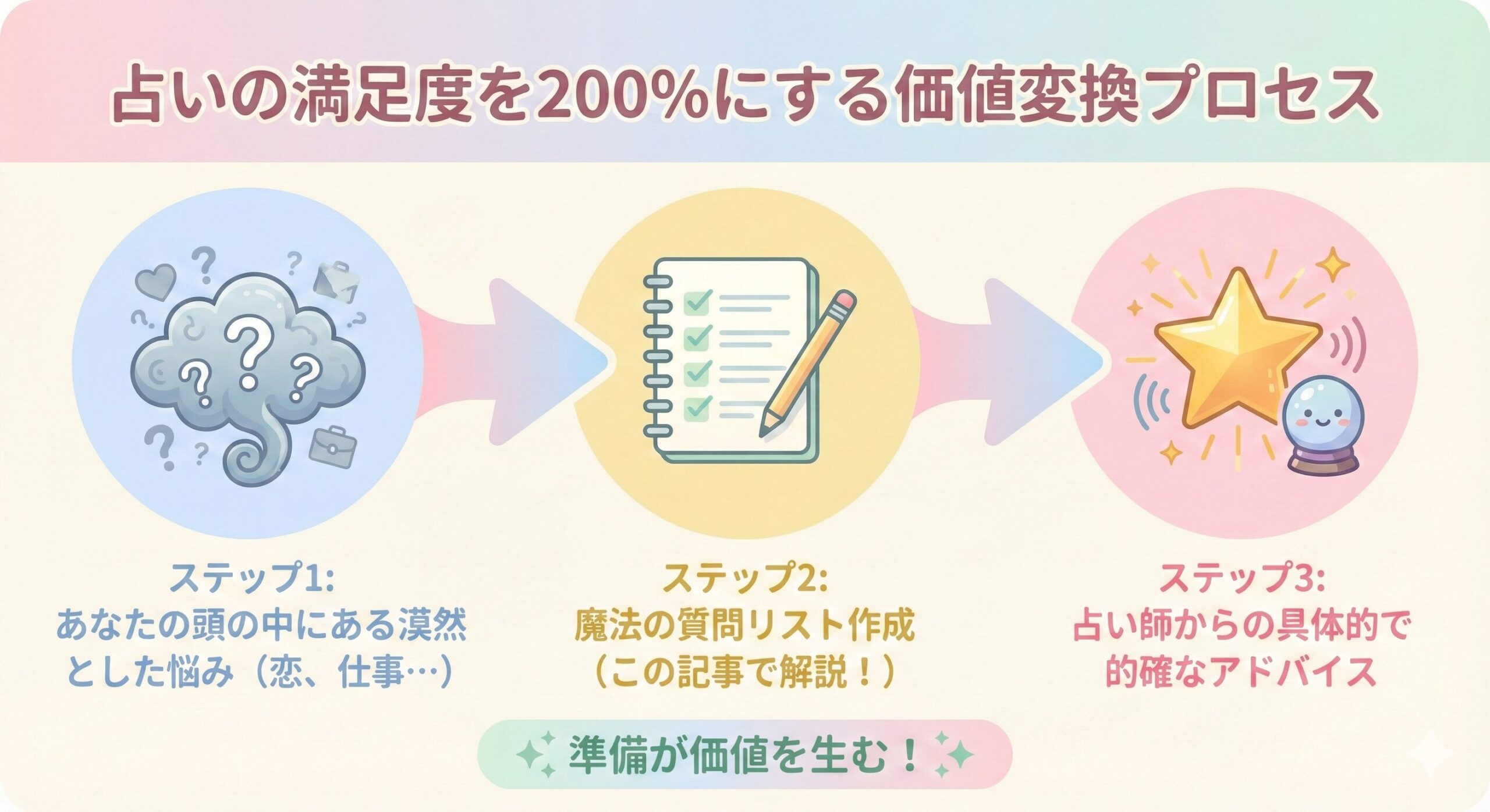 この記事では、初めての占いで後悔しないための、質問の準備方法を3つのステップで解説しました。