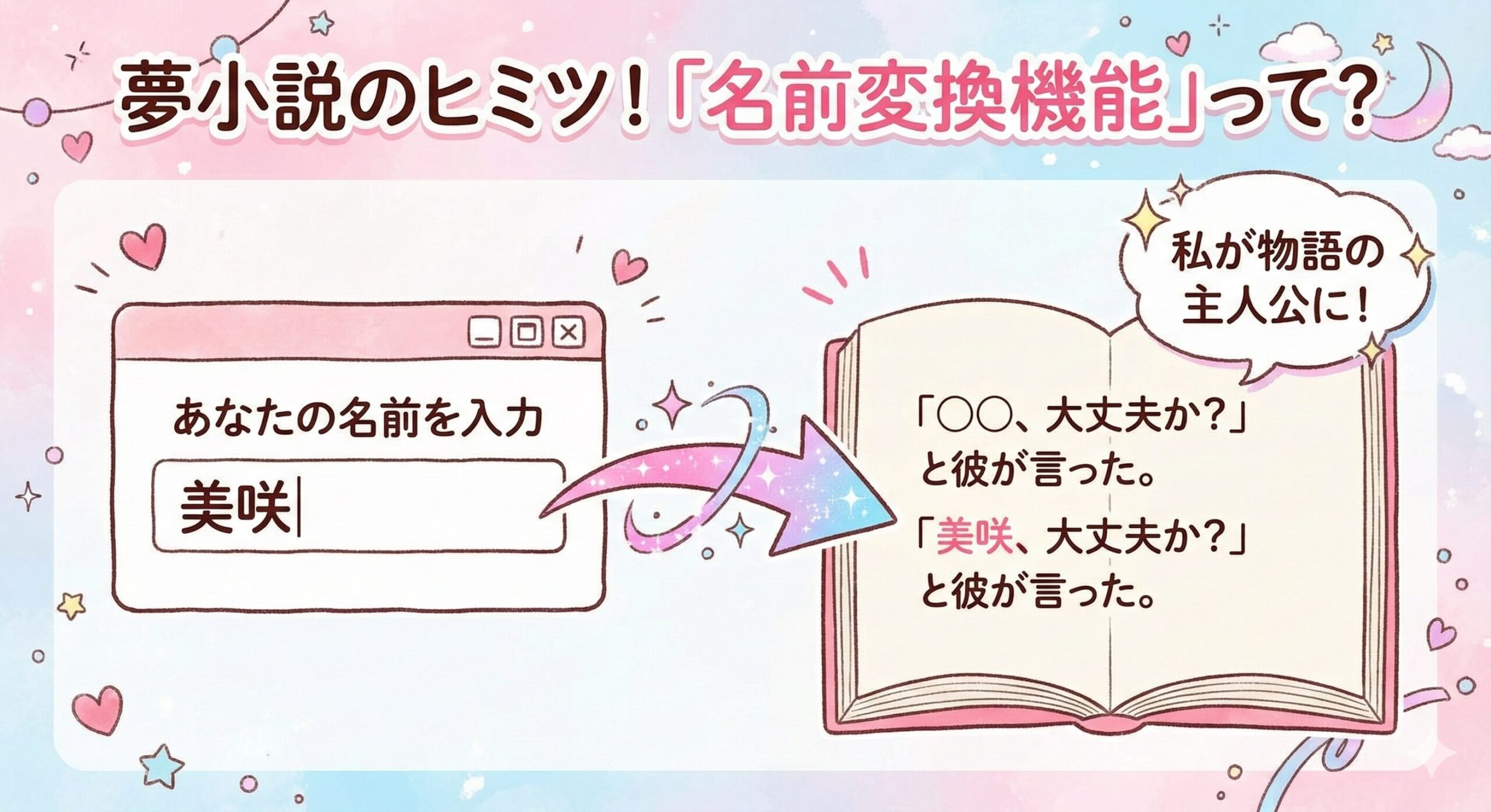 夢小説は、アニメや漫画の世界を舞台にした二次創作小説の一種ですが、普通の小説とは決定的に違う点があります。それは、物語の主人公の名前を、あなた自身の名前(や好きな名前)に変えて読むことができる「名前変換機能」の存在です。
