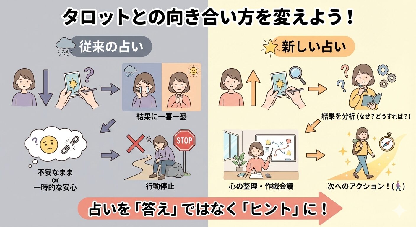 タロットは未来を予言するものではなく、あなたの恋を応援する作戦パートナーです。カードが示すのは、あくまで「今」の可能性の一つ。占いの結果がどうであれ、未来のカードを引くのはあなた自身の行動です。