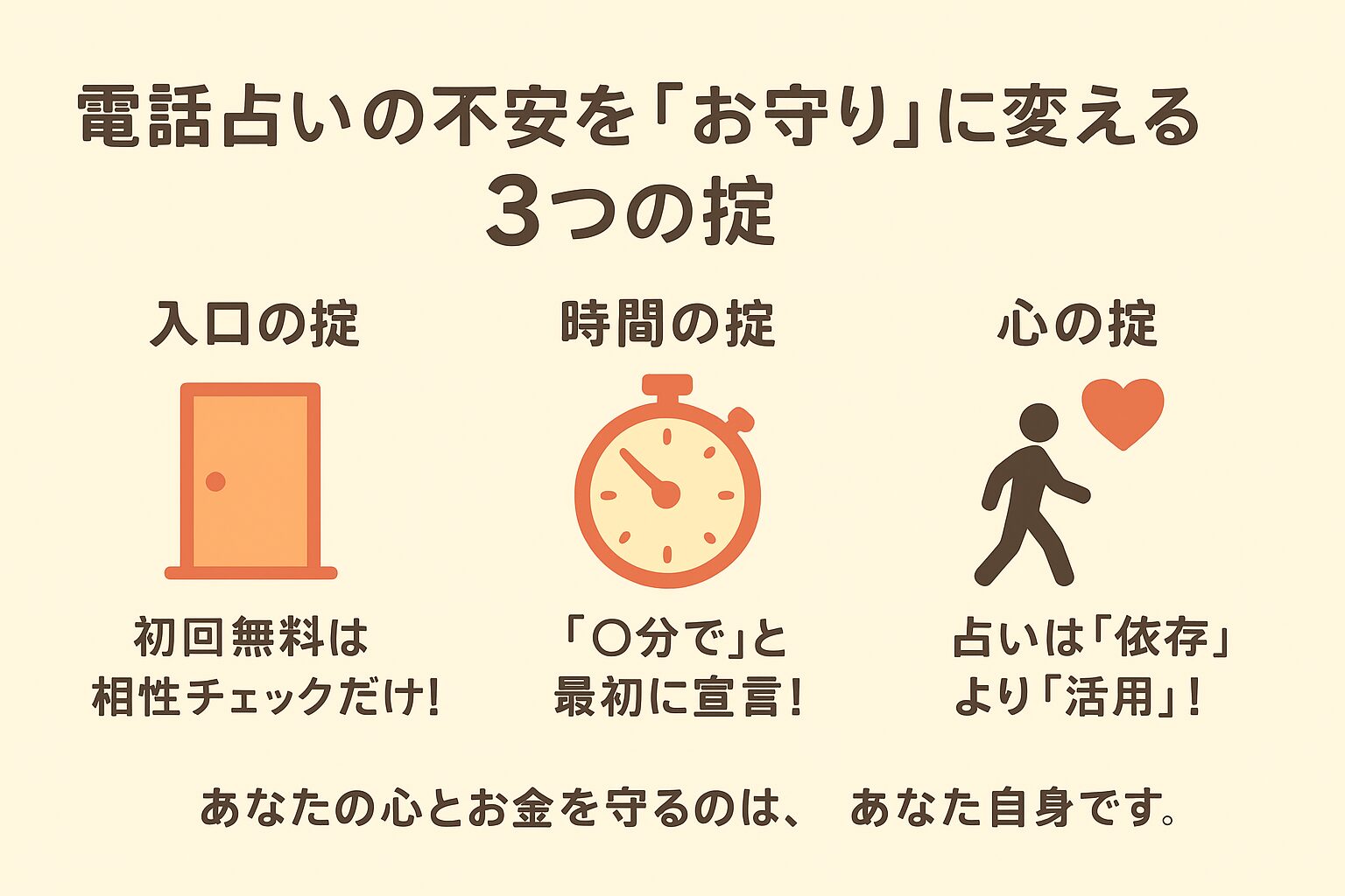 「自己防衛策」は、「占いフィール」のようなサービスを安全に利用するための、あなた自身が装備すべき必須の「利用条件」です。 これからお伝えする3つの「お守り」を、どうか心に留めておいてください。