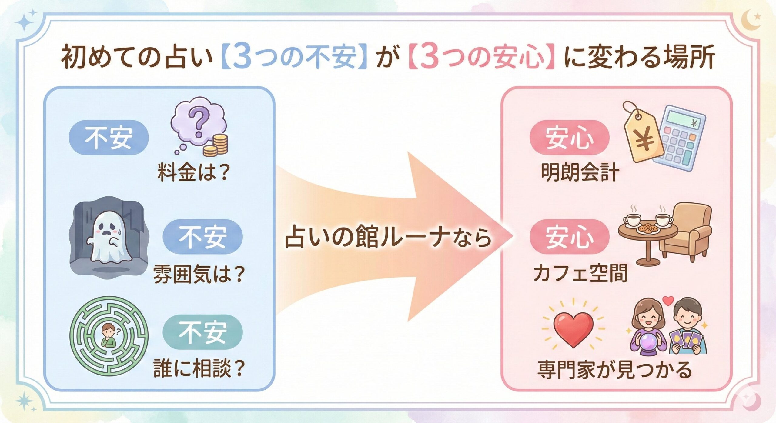 あなたも、この中のどれか、あるいは全部に当てはまるのではないでしょうか。でも、安心してください。これらの不安は、初めて占いを体験する人なら誰もが感じる、ごく自然な気持ちです。そして、「占いの館ルーナ」は、これらの不安を解消するための工夫がしっかりされている場所なんです。