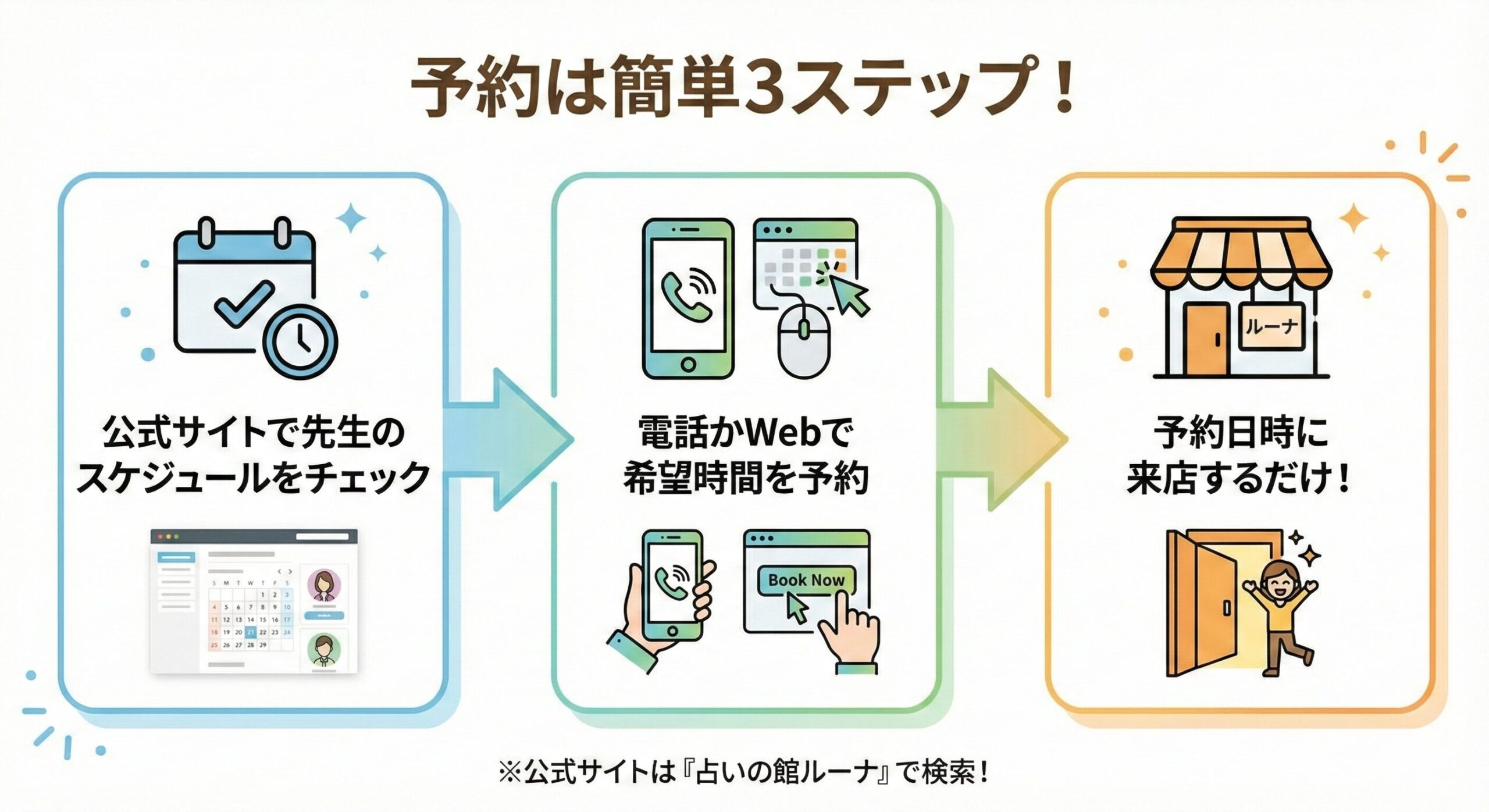 「占いの館ルーナ」が安心できる場所だと分かったところで、次はいよいよ具体的なアクションプランです。ここでは、数多くの占い師の中から今のあなたに合った先生を選ぶヒントと、簡単な予約方法を客観的な情報に基づいてレポートします。