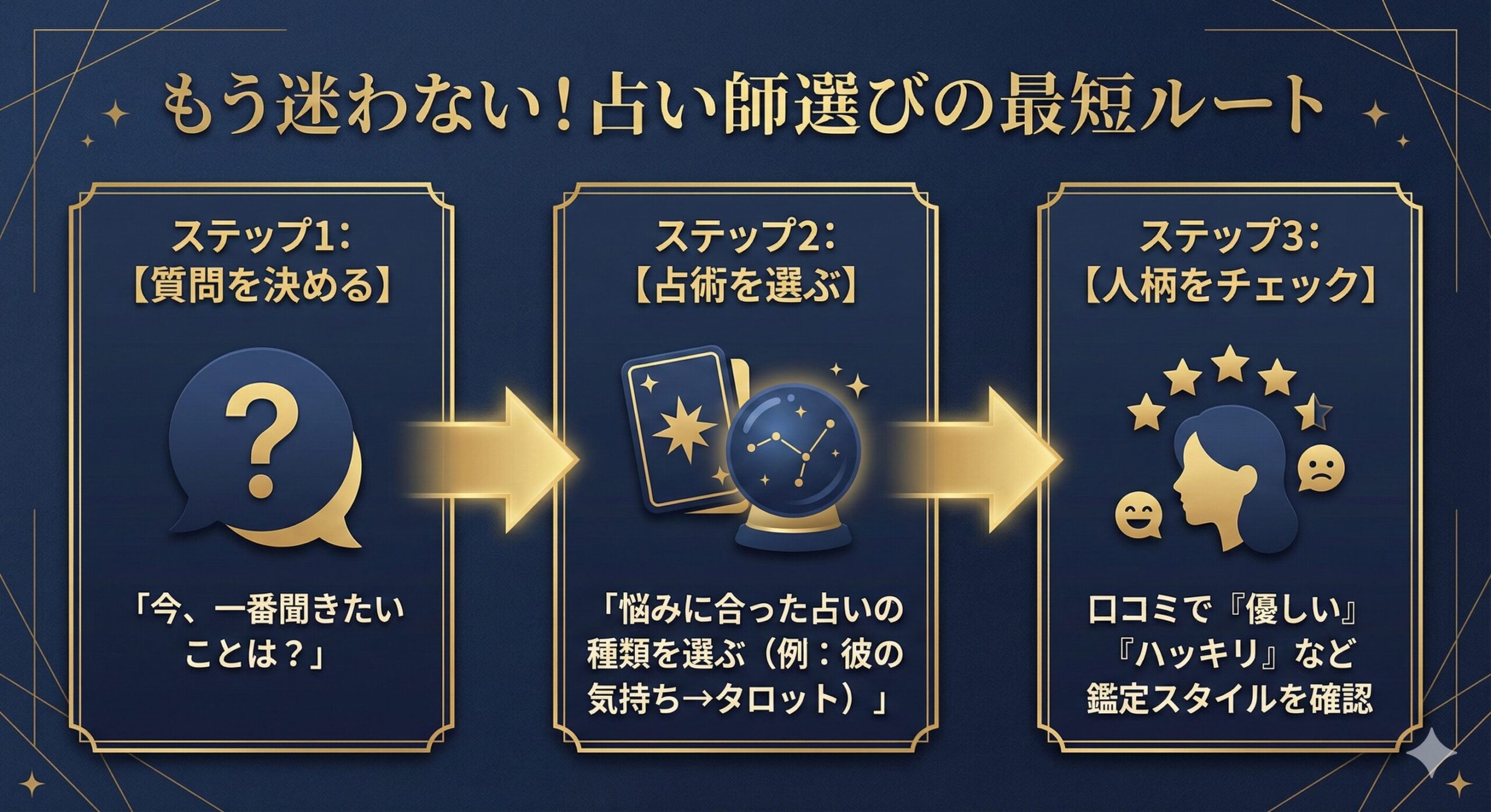 では、どうすれば「相性の良い占い師」に出会えるのか。そのための最短ルートを3つのステップで解説します。この通りに進めば、もう迷うことはありません。