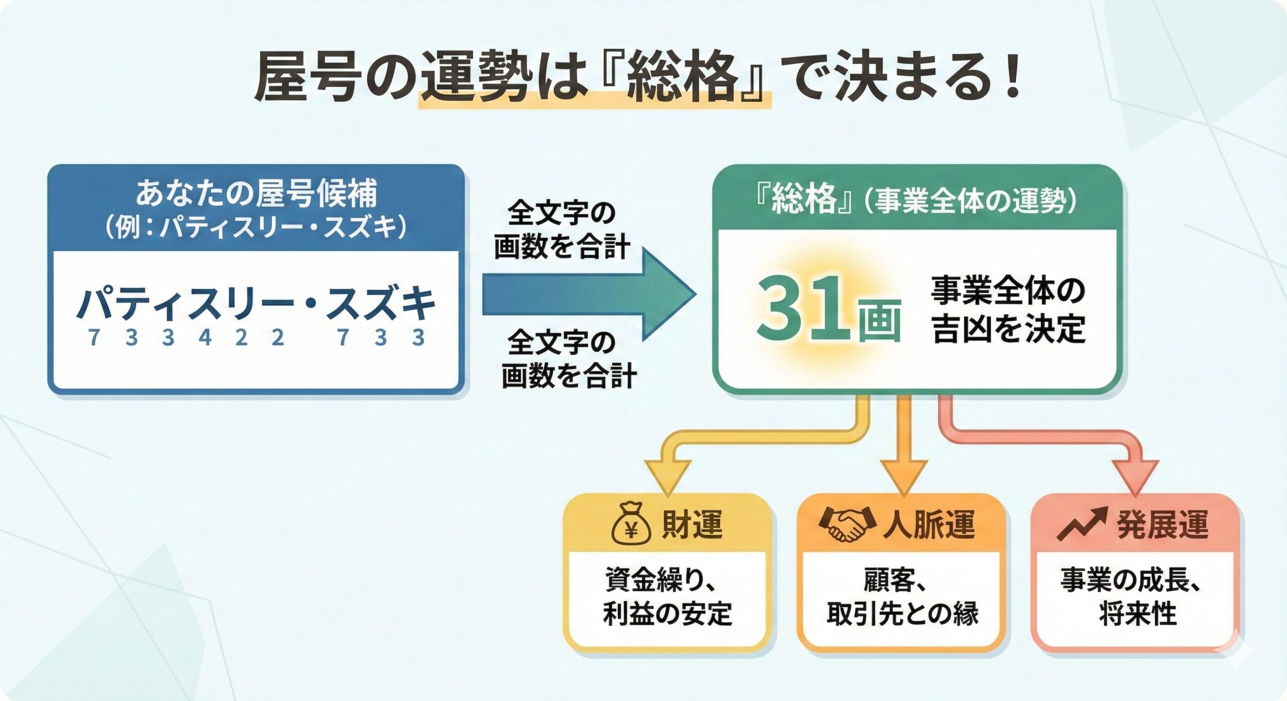 画数占いの世界では、屋号を構成するすべての文字の画数を合計した数字、すなわち「総格」が、その事業全体の運命を象徴する最も重要な指標とされています。なぜなら、部分的な運勢ではなく、ビジネスの総合力、つまり、人・モノ・金・情報のすべてを含んだエネルギーの流れを示していると考えられるからです。