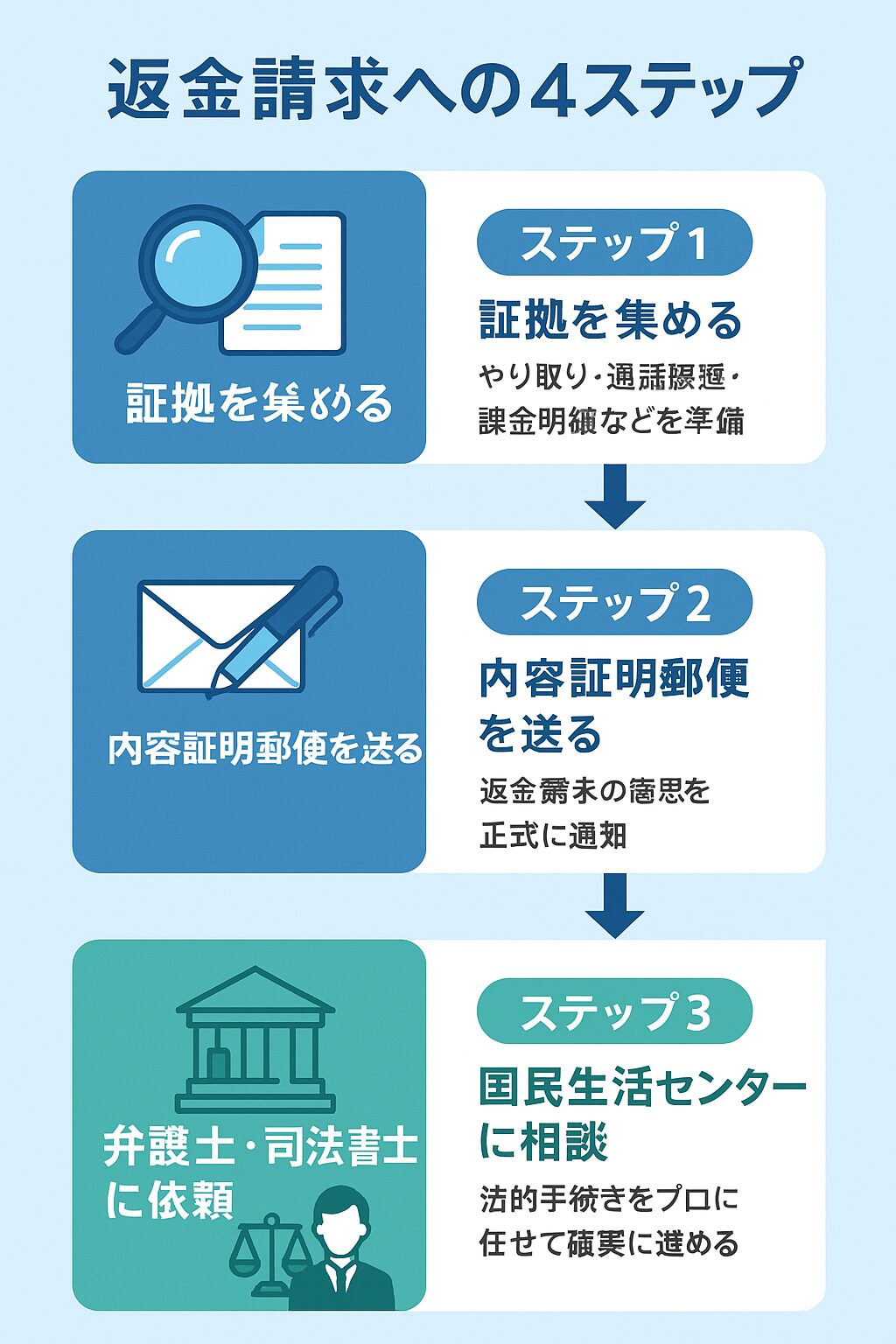 ここからは、電話占いで支払ったお金を取り返すための具体的な手順を解説します。難しく考える必要はありません。この4つのステップに沿って、一つずつ進めていくだけです。