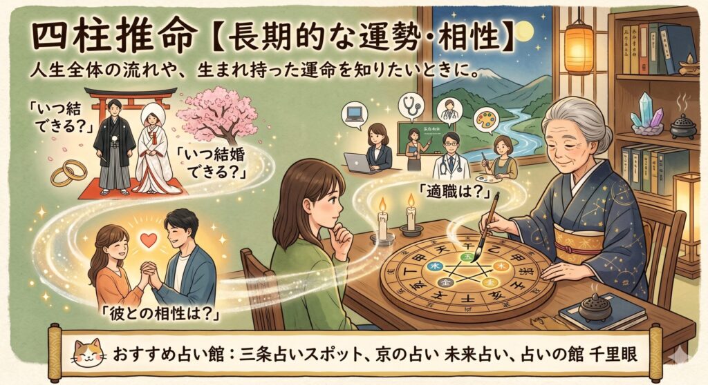 四柱推命:長期的な運勢、相性、人生全体の流れ、結婚時期