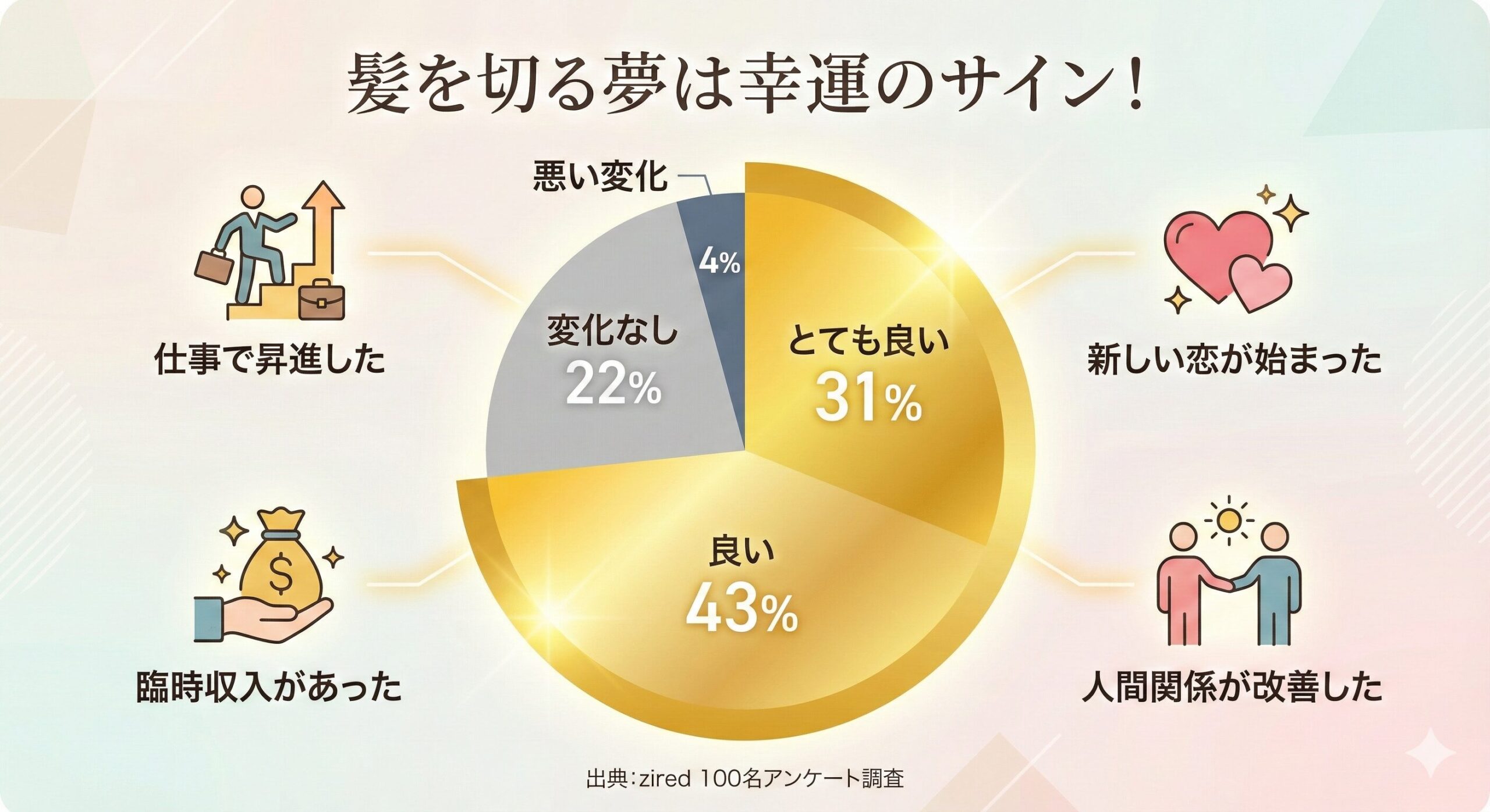 占い専門メディアziredが実施した調査によると、髪を切る夢を見た人のうち、実に74%が「良いことが起きた」または「どちらかというと良いことが起きた」と回答しています。